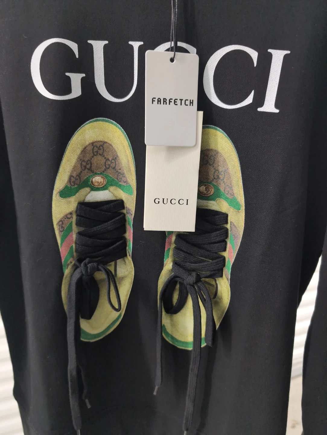 Selling a brand new Gucci black sweatshirt! It features a cool shoe print on the front. Never worn and still has the tags attached. Perfect for adding a touch of luxury to your wardrobe