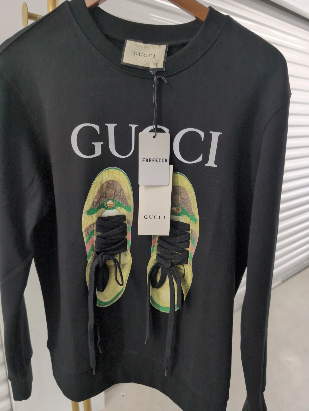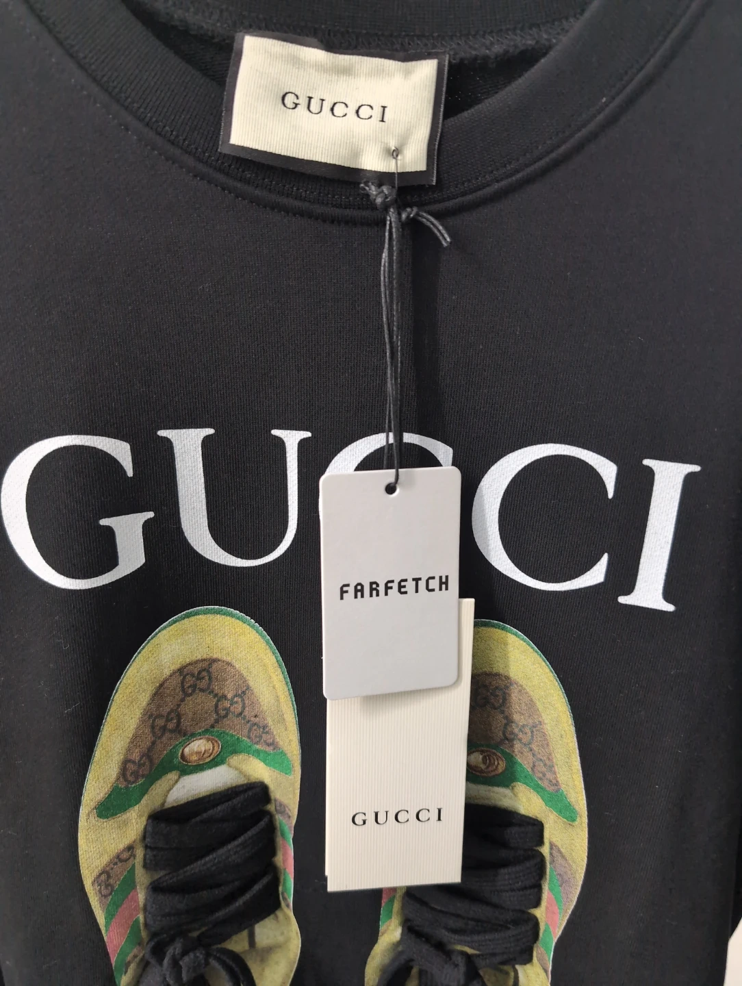 Selling a brand new Gucci black sweatshirt! It features a cool shoe print on the front. Never worn and still has the tags attached. Perfect for adding a touch of luxury to your wardrobe