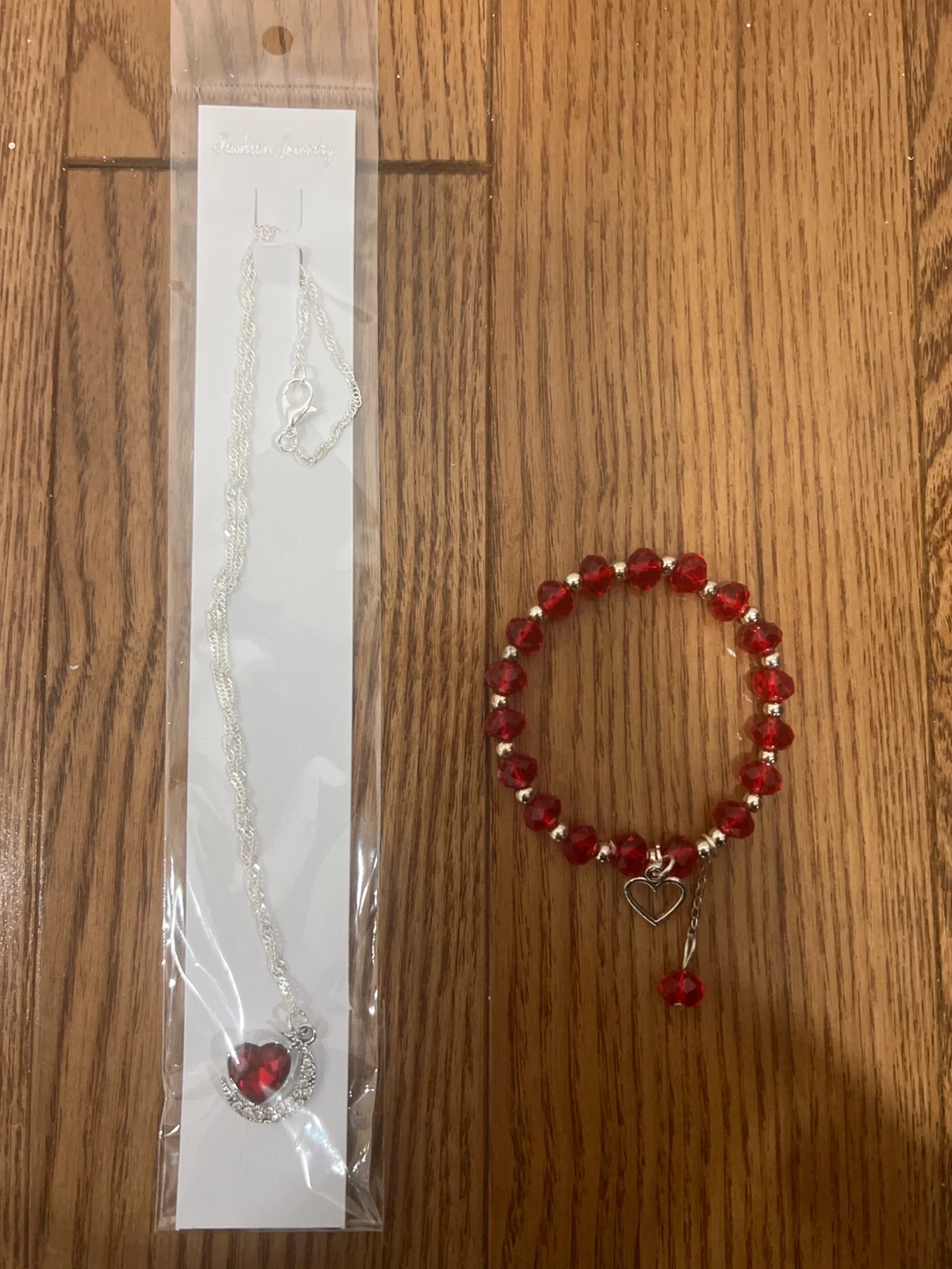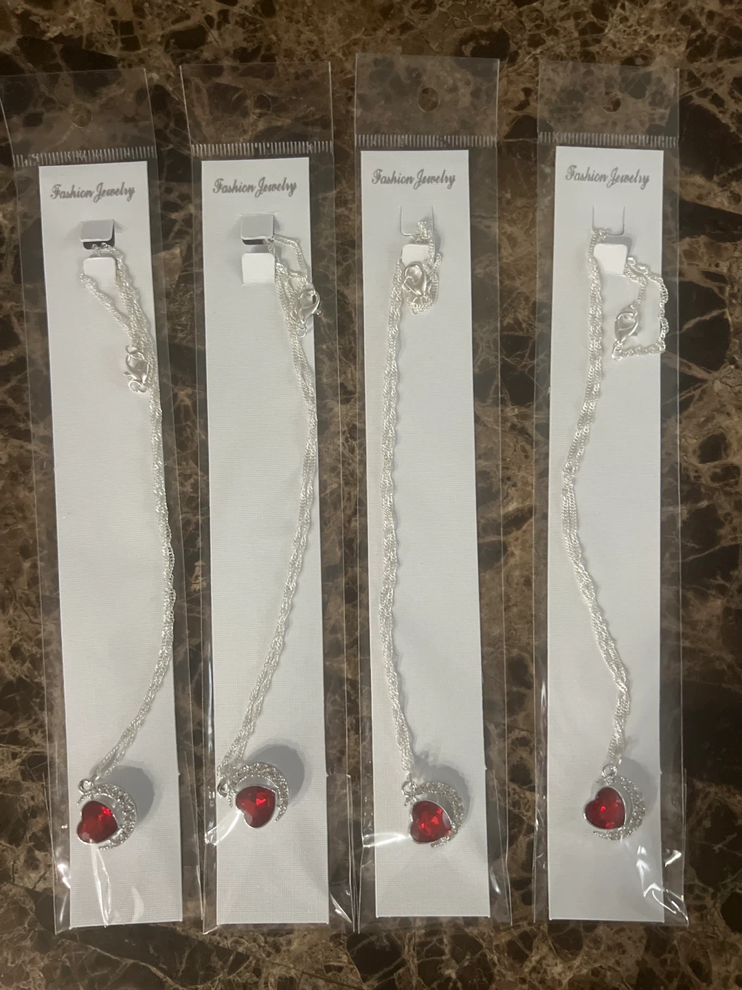 Selling a silver-tone necklace with a red heart pendant. It's a lovely piece of fashion jewelry, perfect for adding a touch of sparkle to any outfit. I can match it with red and silver braclet.