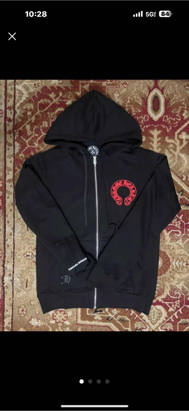 10Chrome Hearts black zip-up hoodie with red logo on the back and small logo on the sleeve. It's in great condition and ready for a new home!