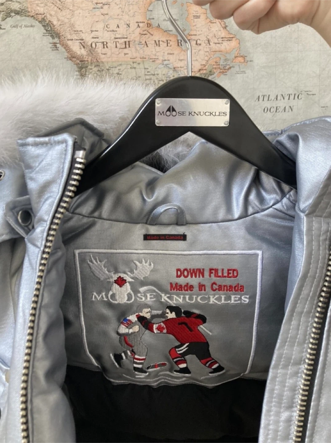 *X-Large Adult silver chrome moose knuckle bomber jacket , excellent for the cold winters that are coming up. This jacket gives you style and keeps you super warm without having to wear multiple layers of clothing.