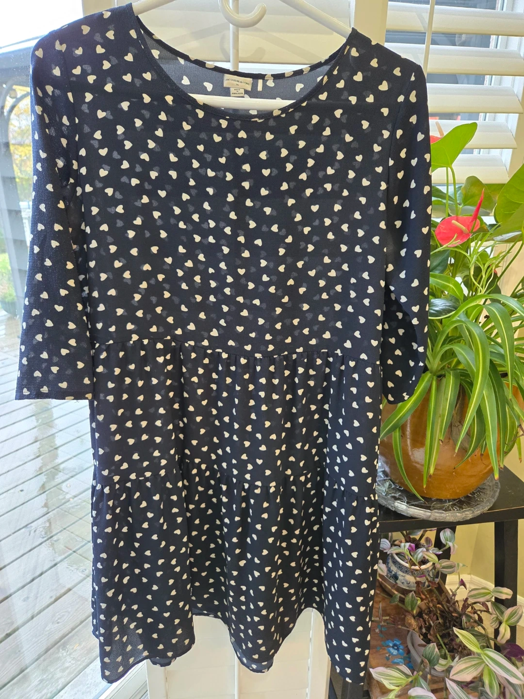 This is a lovely dress in a navy blue colour with a cute heart print. It's a size 36 and has a comfortable, flowy fit. Perfect for casual outings or dressing up with accessories!