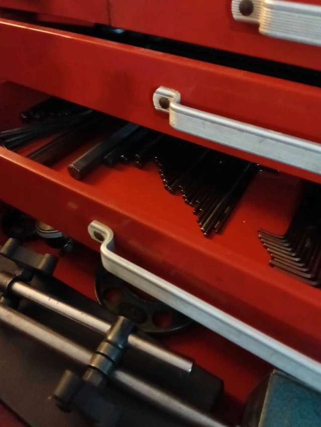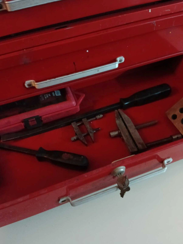 This is a used, red Beach tool chest, with some tools! This sturdy chest has a few scratches and dents, which add to its vintage charm. It is ready to keep your tools organized. If the ad is up, it's still available!