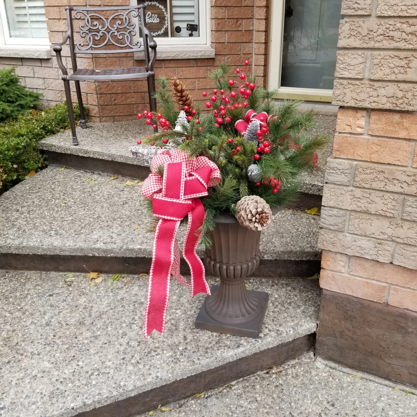 This beautiful Christmas urn planter is ready to add some holiday cheer to your porch or entryway! It features a mix of pine branches, red berries, pinecones, and a charming red and white checkered bow. Perfect for adding a touch of festive decor to your home this season