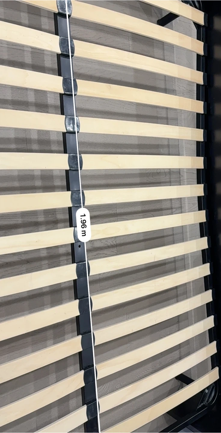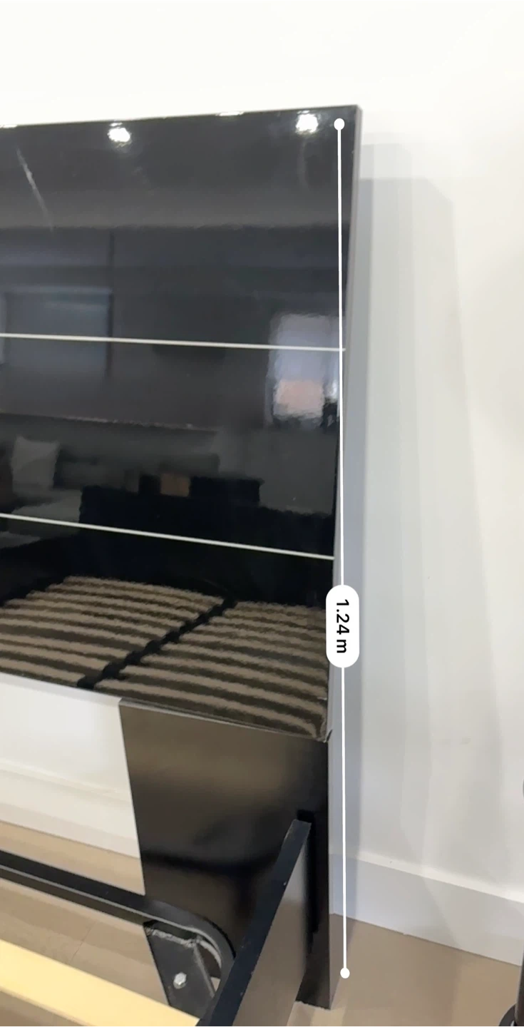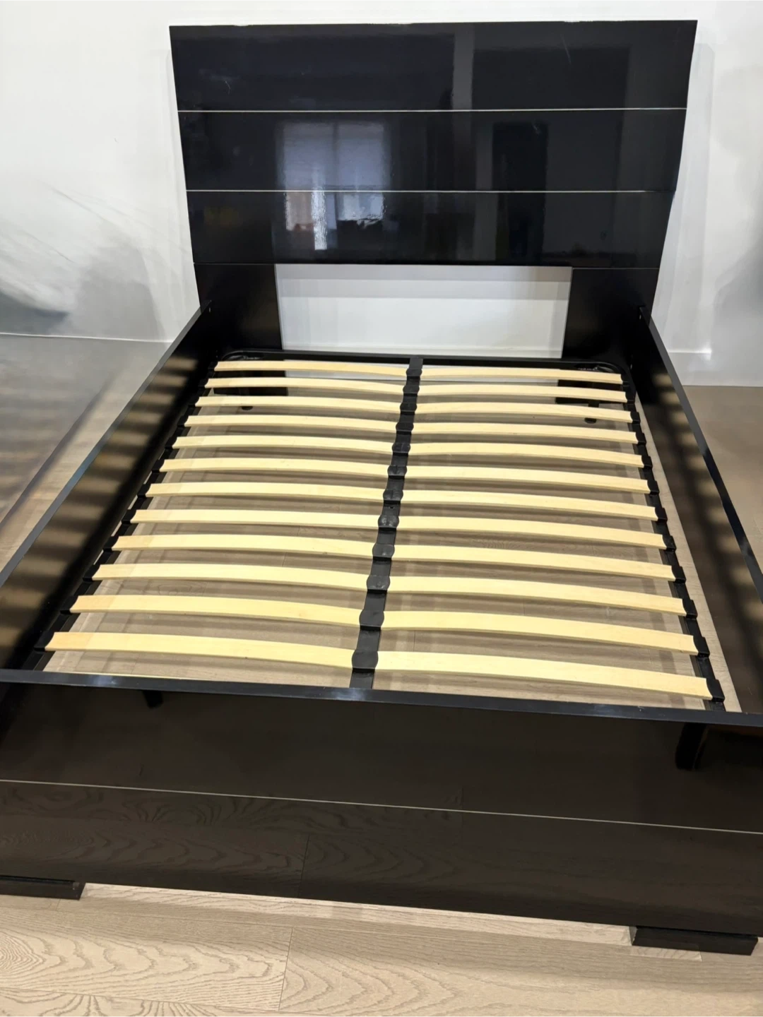 Selling a queen bed frame in black. The dimensions are approximately 1.96m in length and 1.24m in height. It's in good condition and ready for a new home!