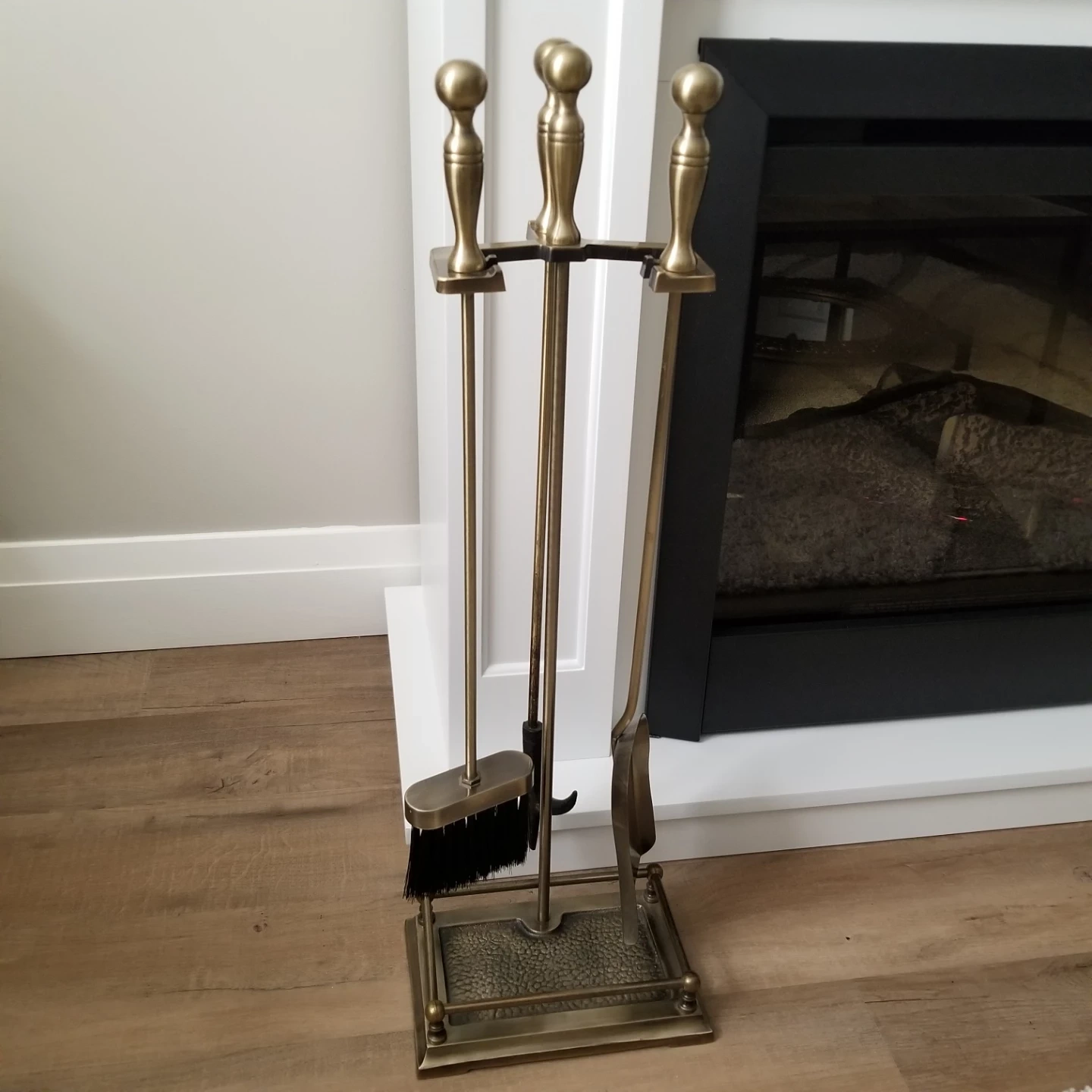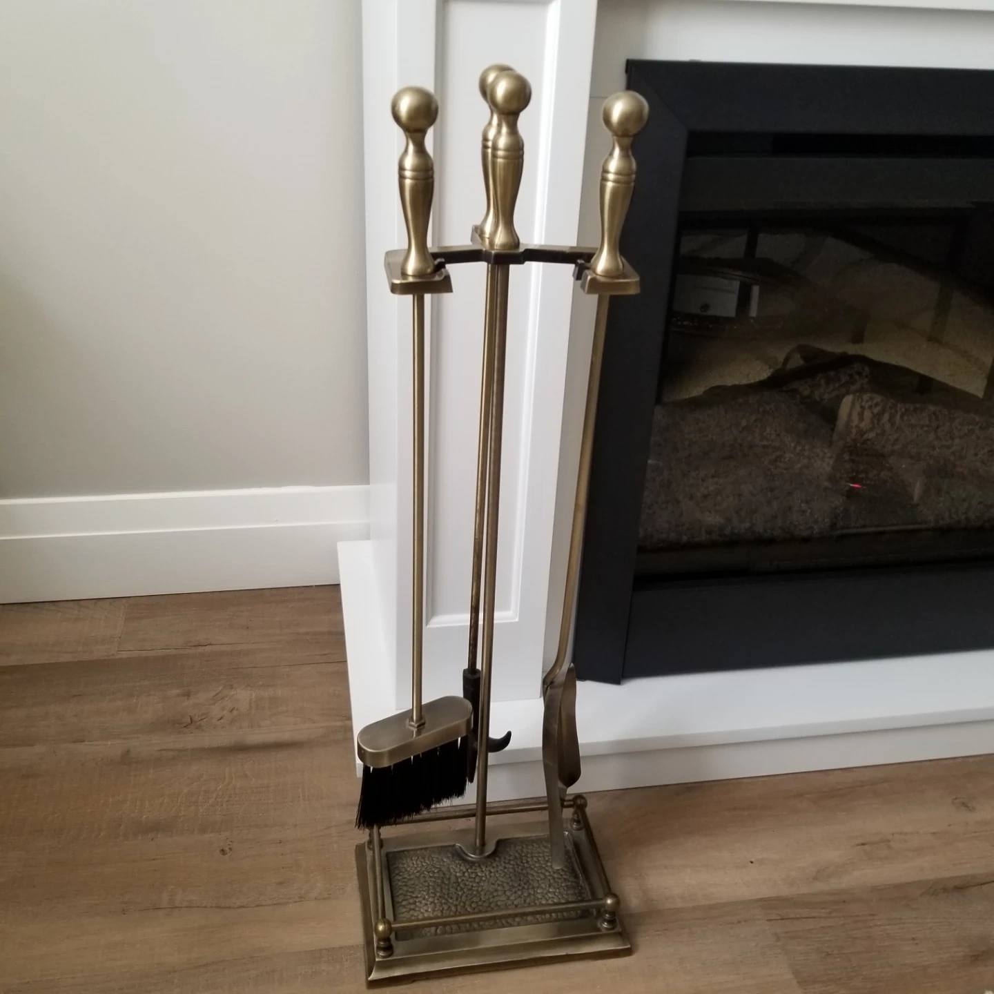 I'm selling a fireplace tool set with an antique brass finish. It includes a stand, poker, shovel,