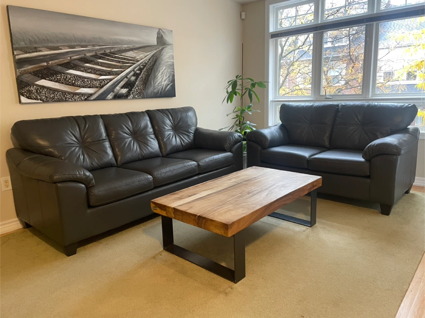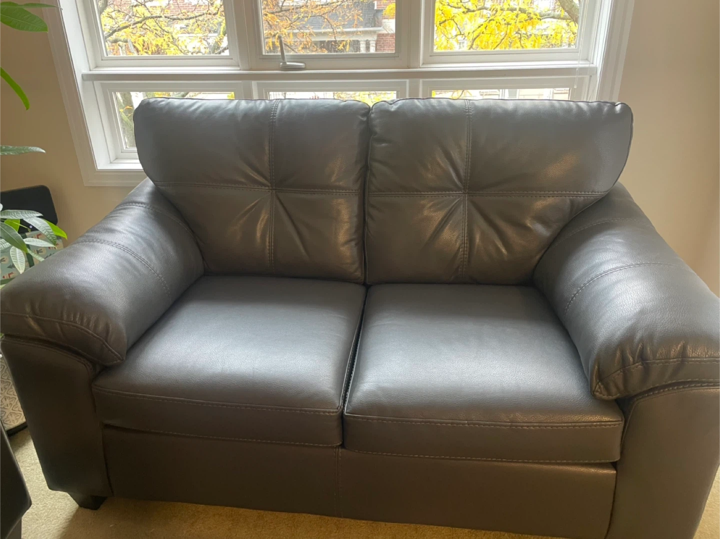 Selling a comfy leather loveseat and sofa set in grey. Both are in great condition like new and would be a great addition to any living room!