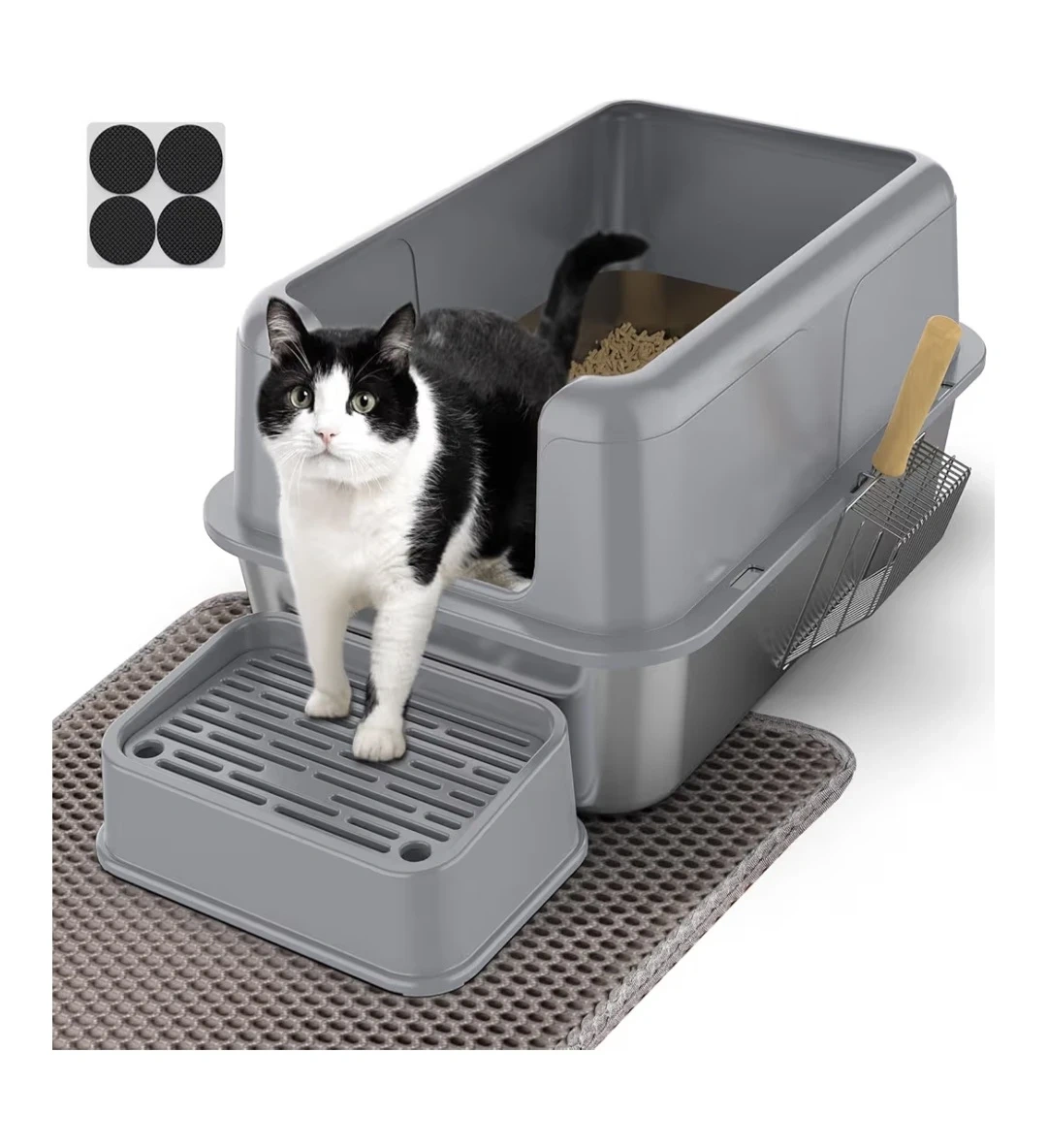 Selling a high-wall cat litter box, perfect for keeping the mess contained! It features stairs designed for older cats, making it easy for them to access. Also includes a metal cat litter scoop and non-slip stickers for added convenience