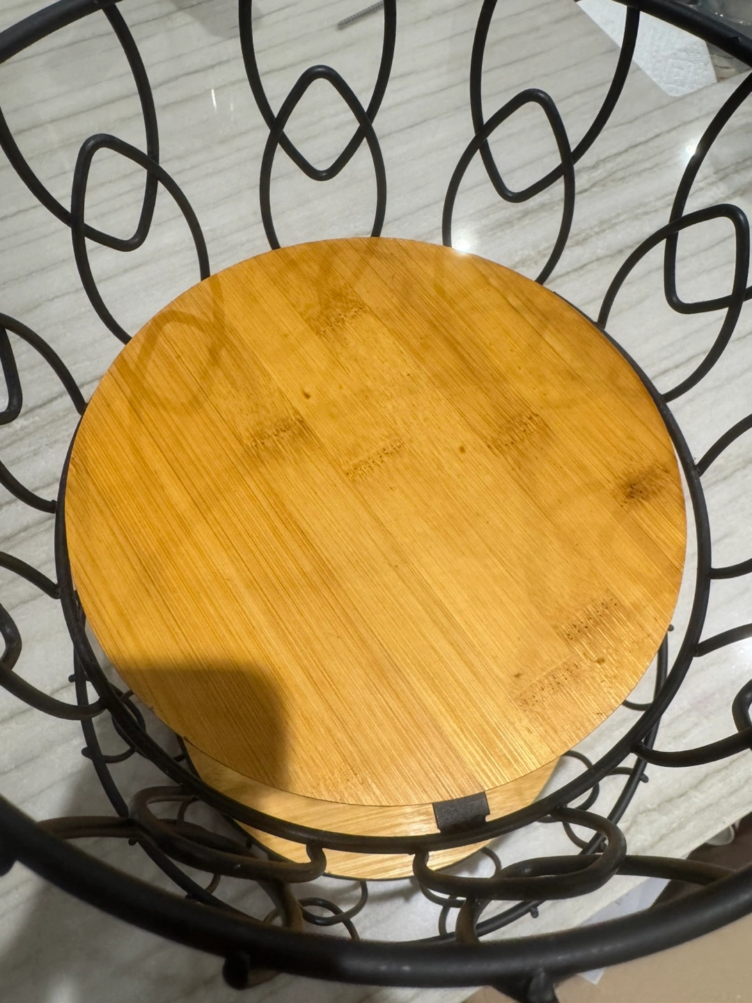 This two-tier basket is perfect for displaying fruit or other items in your kitchen or dining area! It features a black metal frame with wooden platforms on each tier. It's in great condition and ready to add a touch of style to your home.