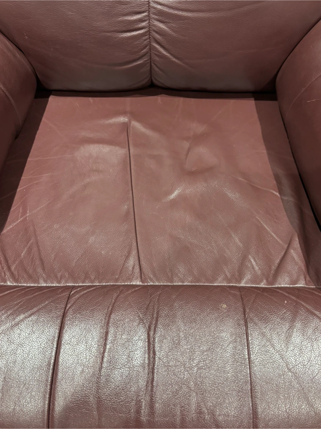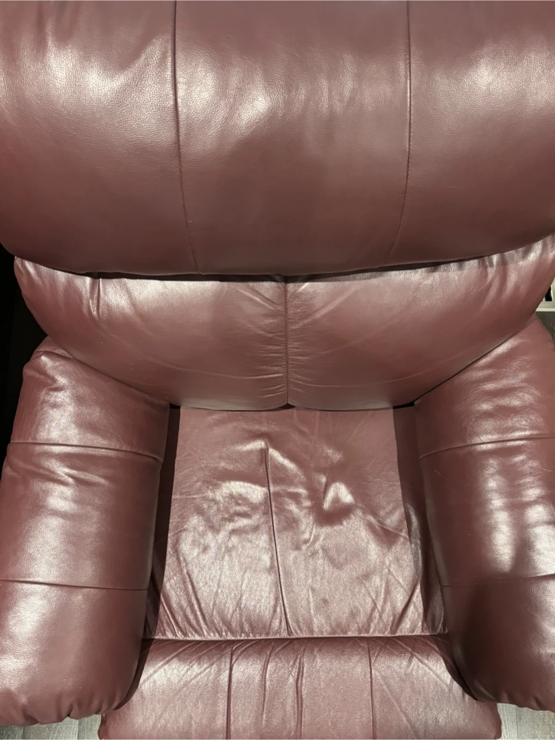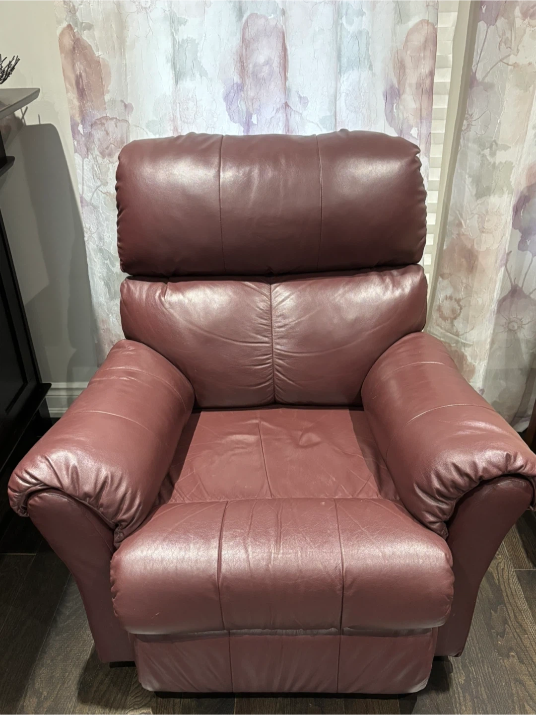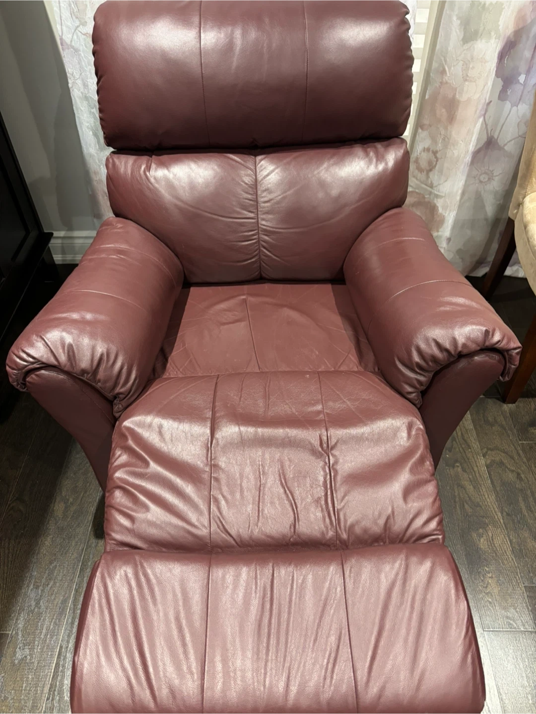 10Selling a comfy burgundy leather recliner chair! It's in perfect condition! The leather is soft, the chair reclines smoothly and feels very comfortable. It's a great addition to any living room or den.