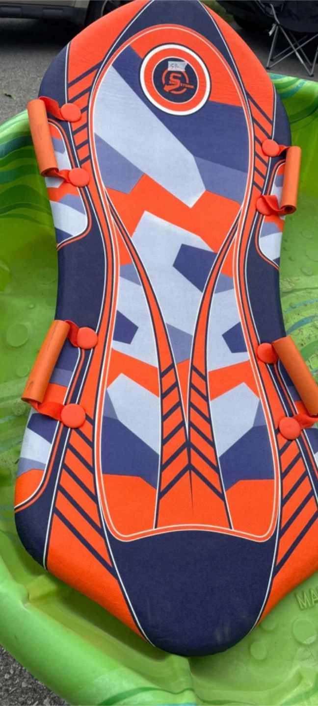 Selling a Storm snow sled in great condition! It features a cool orange and blue geometric design and comfortable orange handles. Get ready for some winter fun!