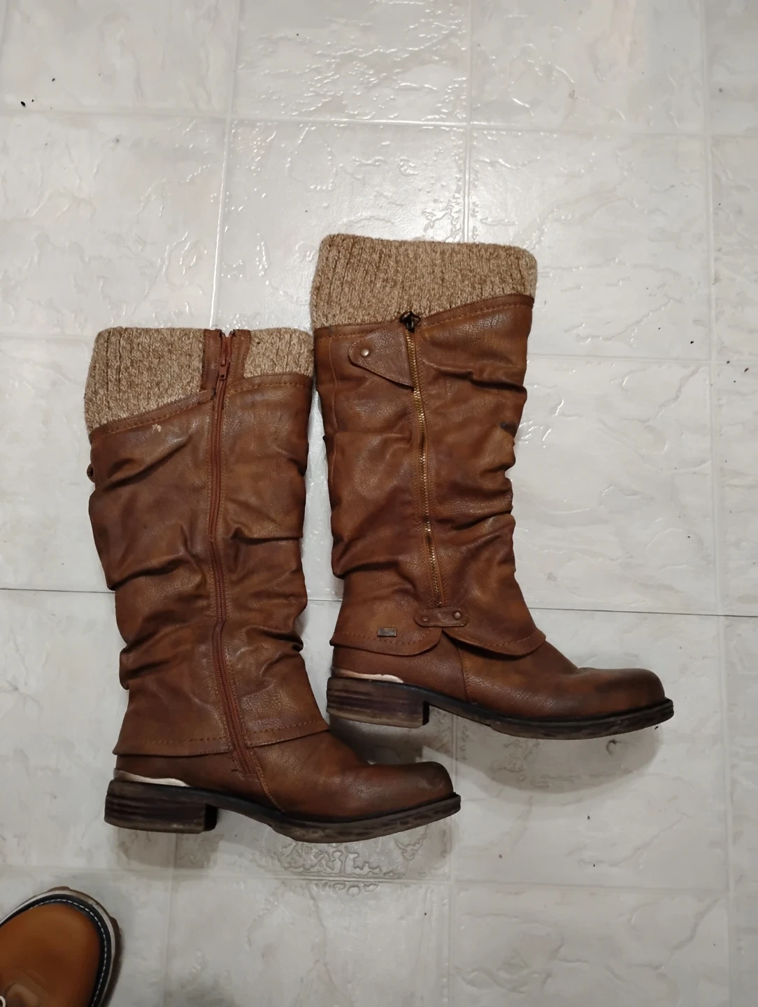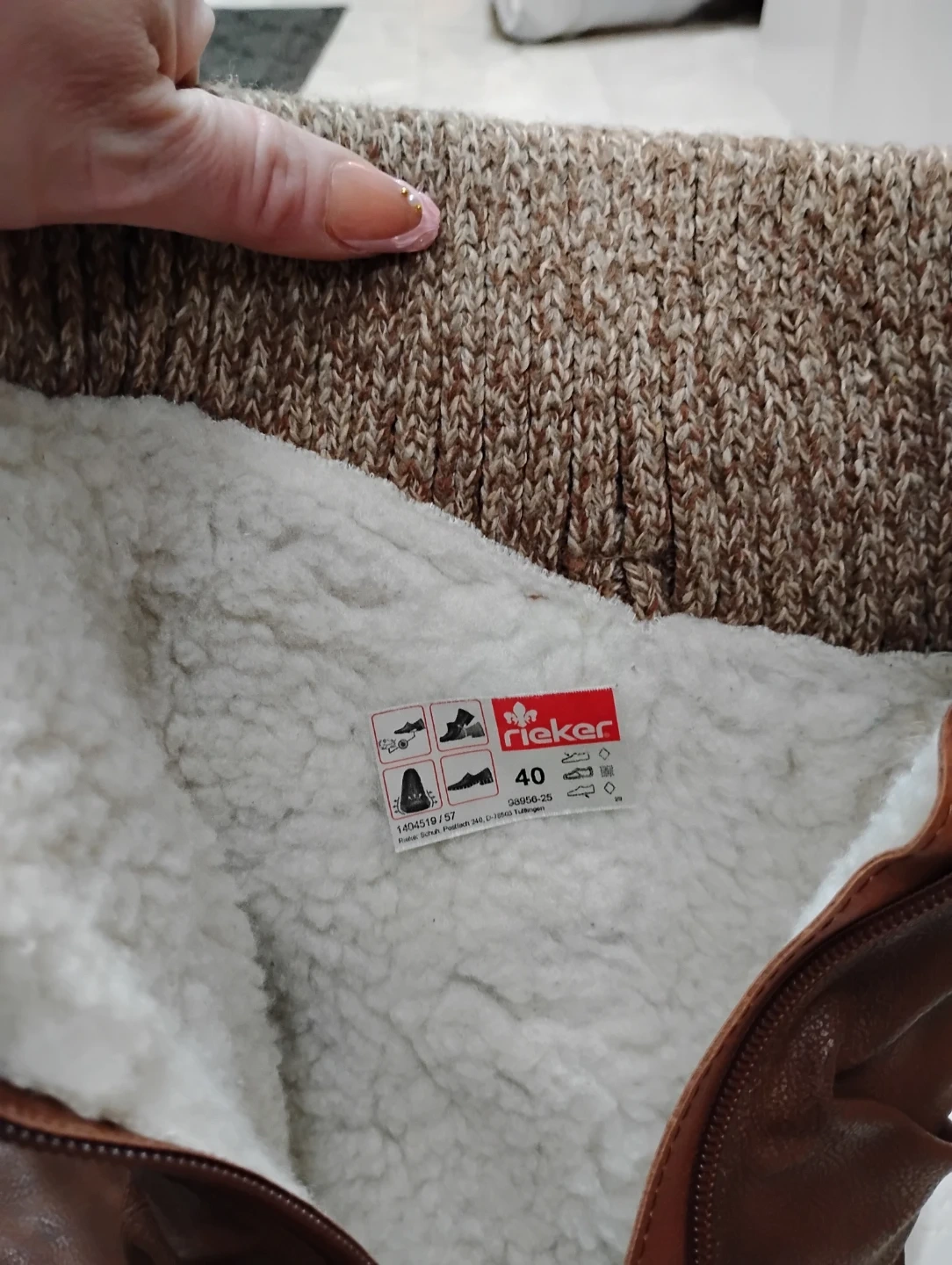 Selling a pair of Rieker boots in brown. They're a size 40. These boots have a cozy, knit-style lining at the top and a side zipper for easy wear. Perfect for adding a bit of style to your wardrobe!
