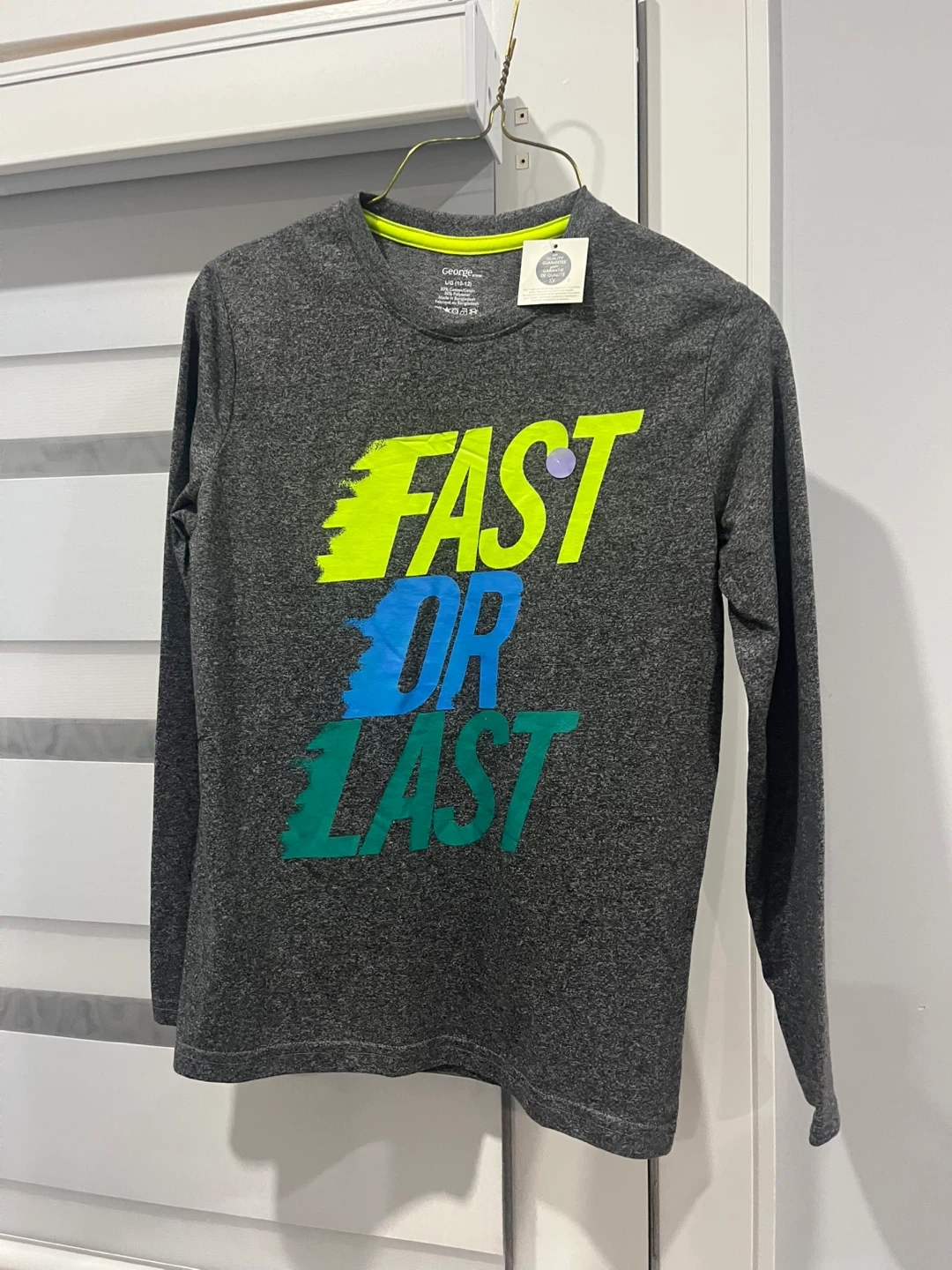 Selling a George brand long sleeve tee. It's a size M and features a cool "FAST OR LAST" graphic. Perfect for active kids!