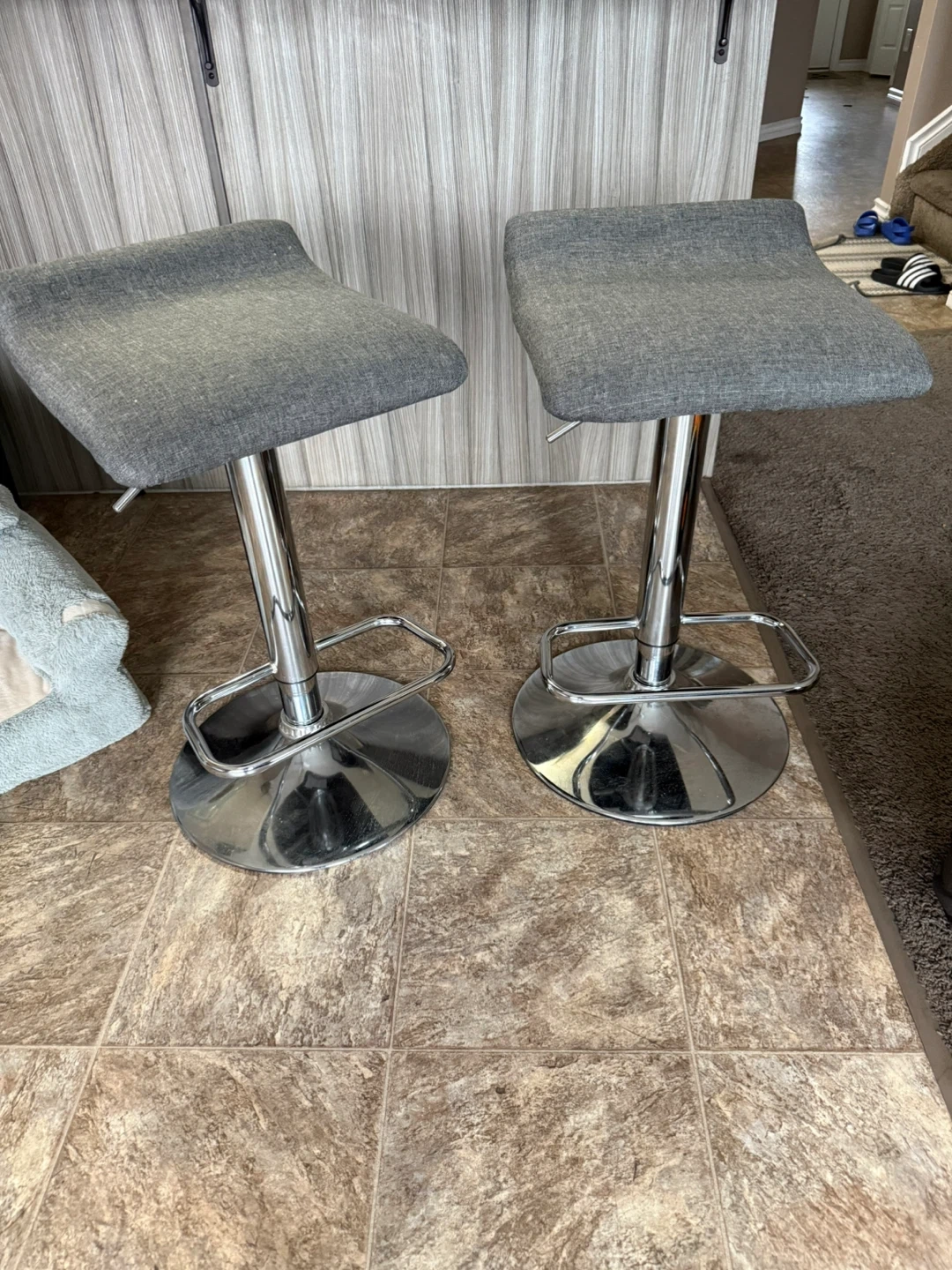 Selling a set of two bar stools. They have a comfortable grey seat and a sturdy chrome base. They're in great condition and would look great in any kitchen or bar area!