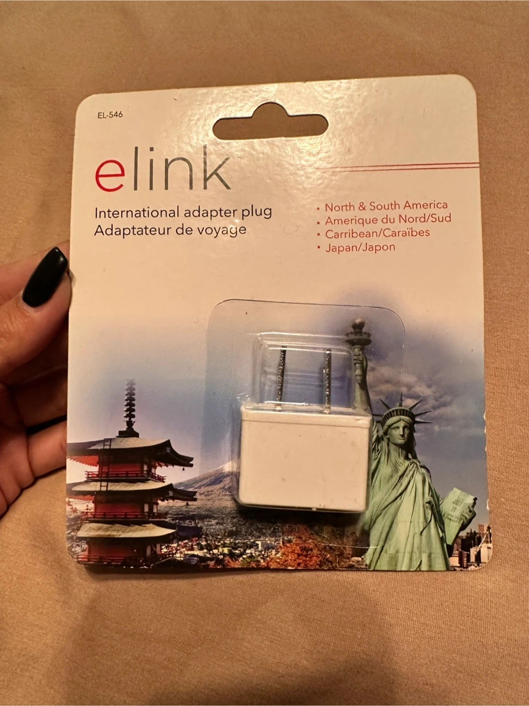 Selling a brand new elink international adapter plug! It's perfect for travel to North & South America, the Caribbean, and Japan. It has flat pins and is model EL-546. Please note this adapter does not convert electrical current, so you'll need a converter or transformer if your appliance requires it