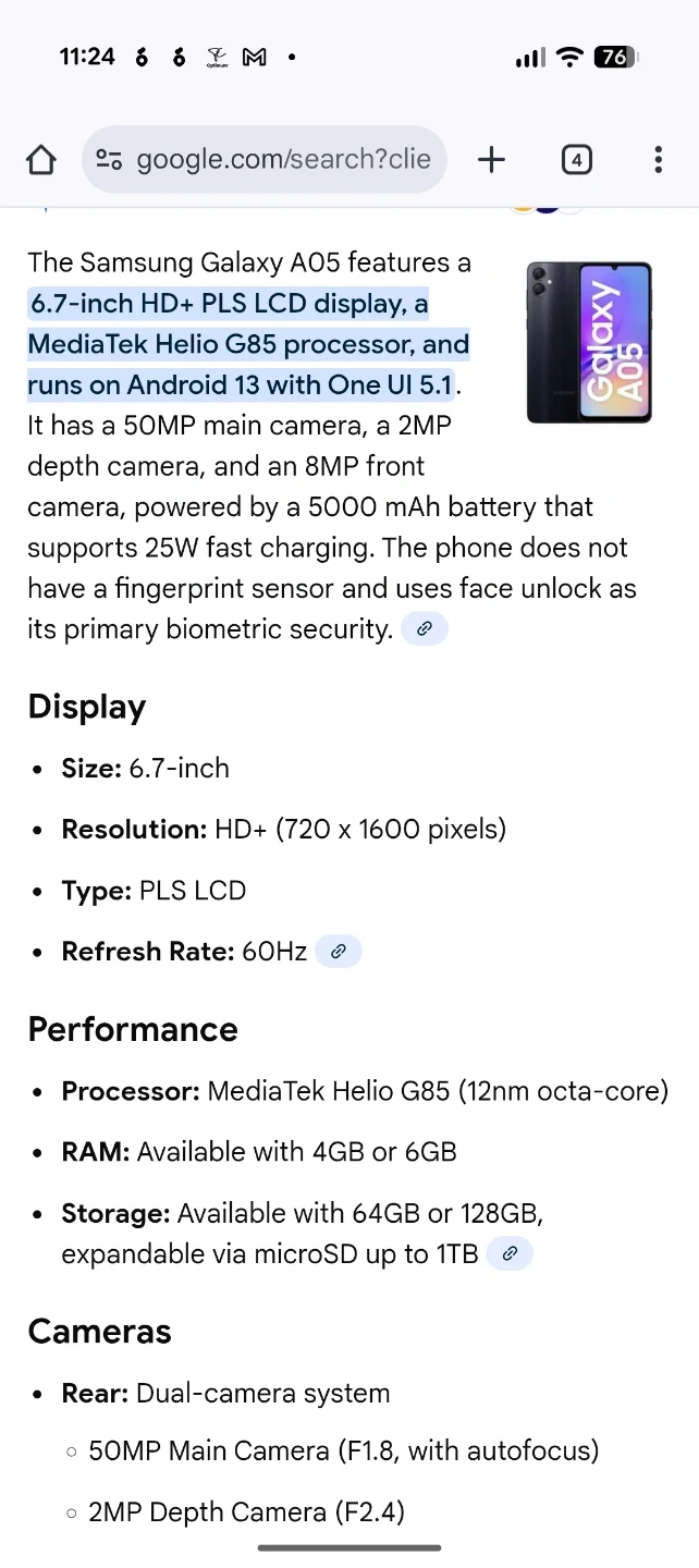 The Samsung Galaxy A05 features a 6.7-inch HD+ PLS LCD display, a MediaTek Helio G85 processor, and runs on Android 13 with One UI 5.1 and 128 GB. It has a 50MP main camera, a 2MP depth camera, and an 8MP front camera, powered by a 5000 mAh battery that supports 25W fast charging. The phone does not have a fingerprint sensor and uses face unlock as its primary biometric security.