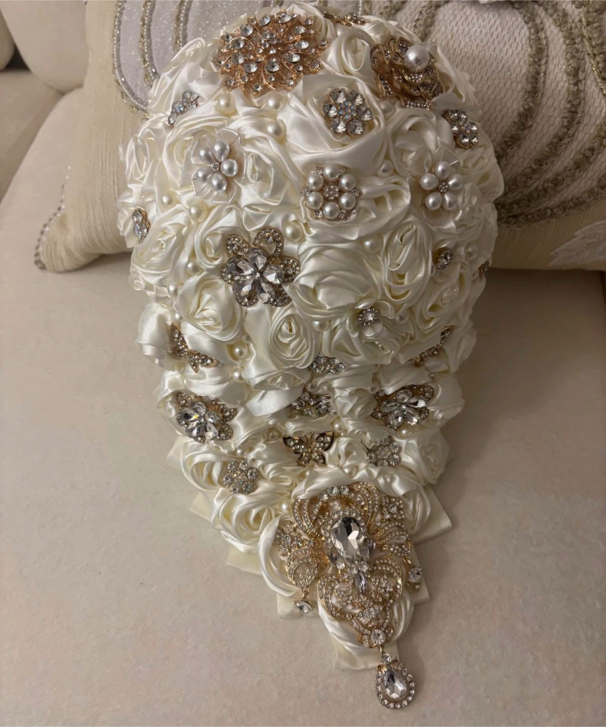 Selling a beautiful wedding bouquet! It features a cascade design with white satin roses, pearls, and sparkling rhinestones. Perfect for adding a touch of elegance to your special day