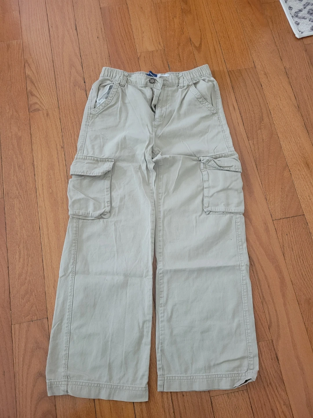 I have two pairs of kids' pants for sale. One is a pair of khaki cargo pants and the other is a pair of light wash jeans. Both are size 12