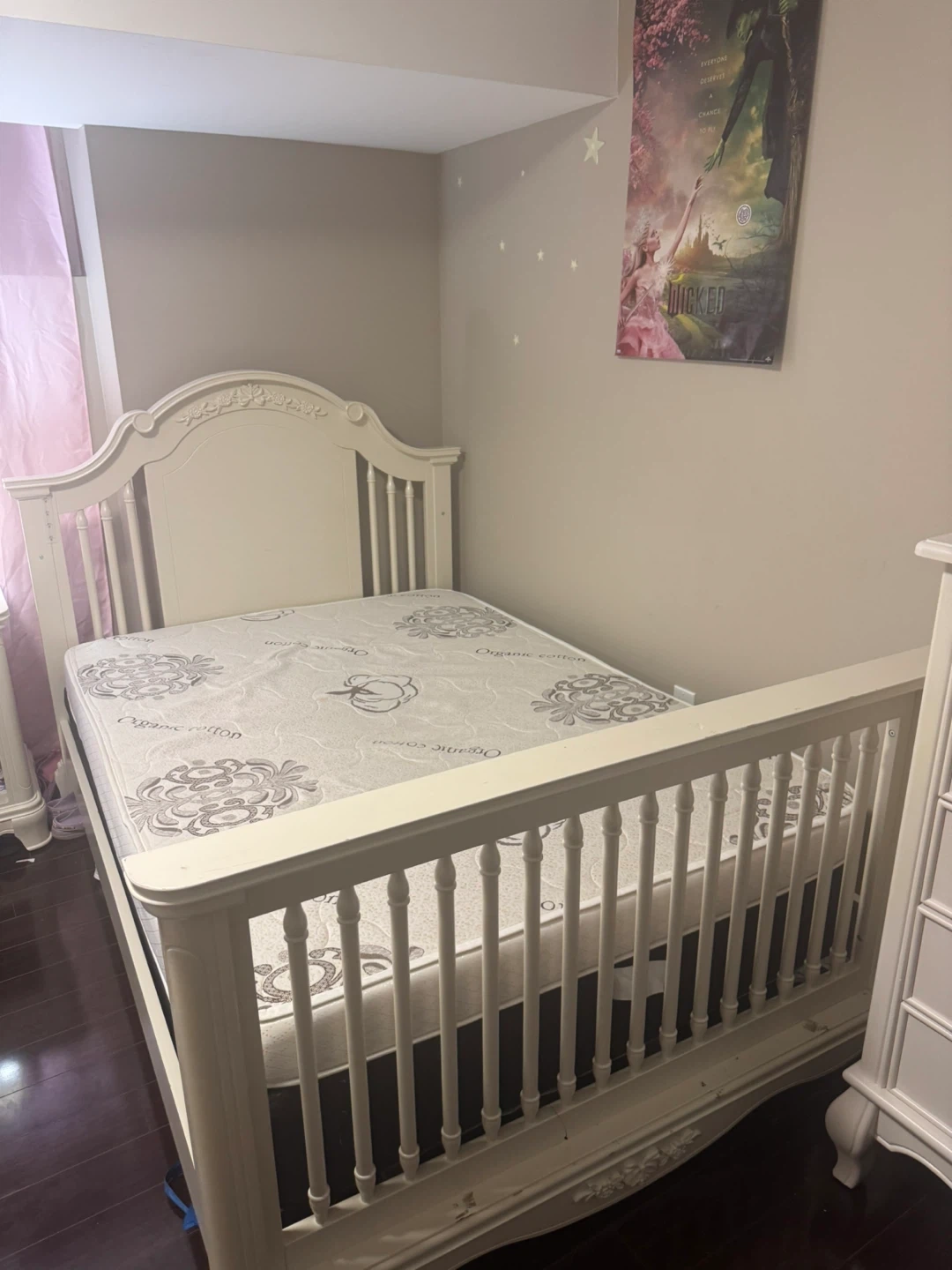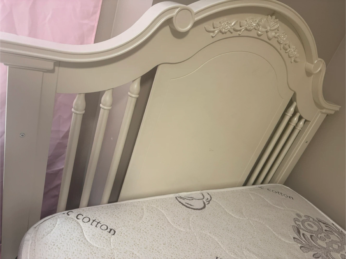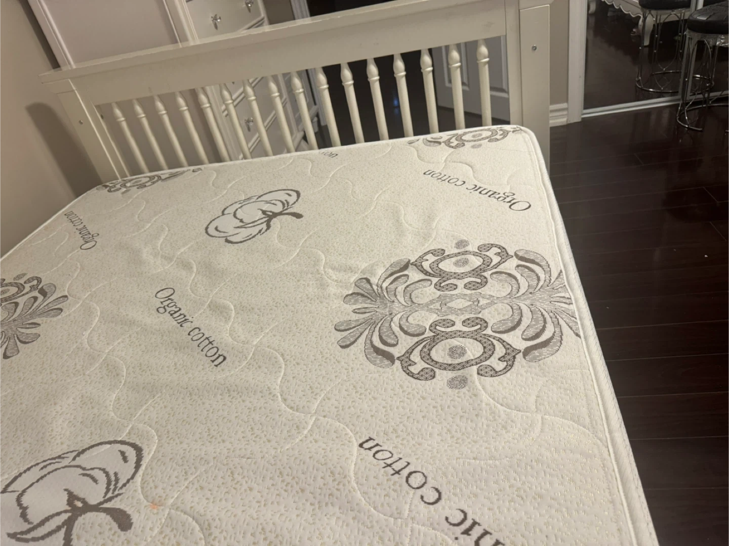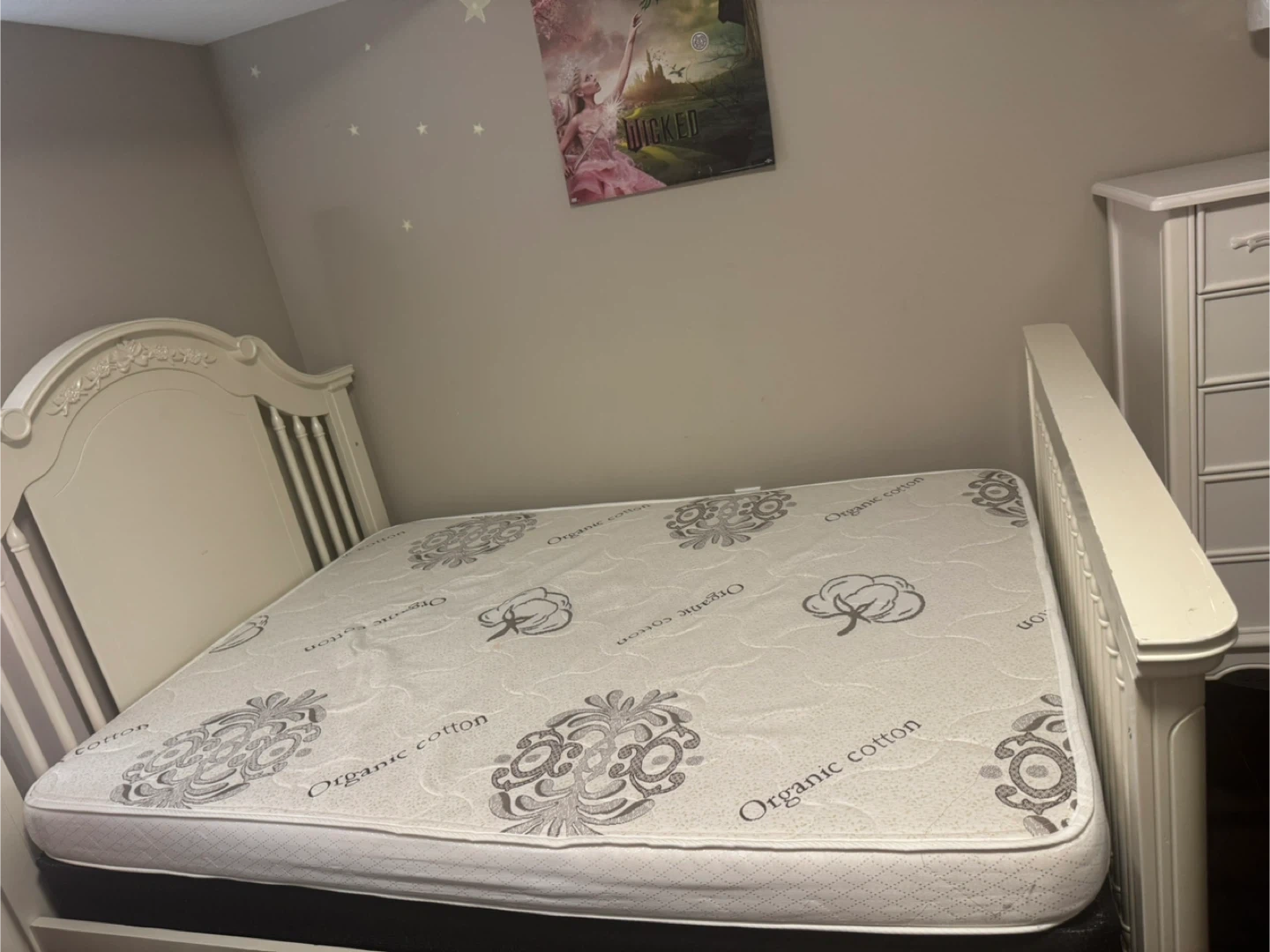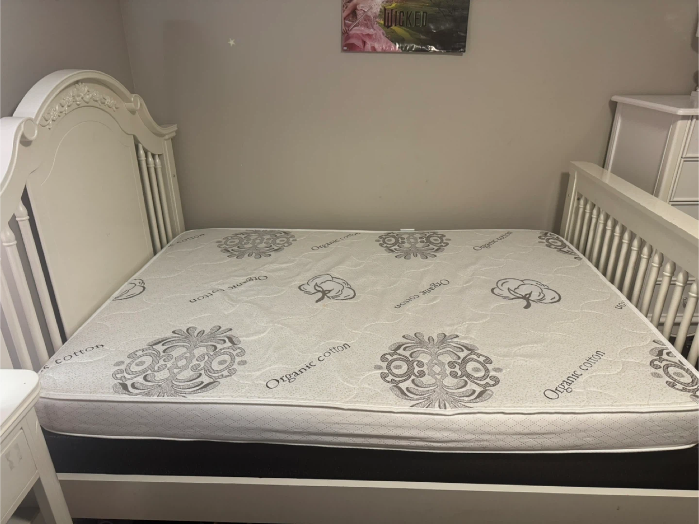 Selling a charming white wooden bed frame. It comes with a mattress featuring an organic cotton design. Perfect for adding a touch of elegance to any bedroom!