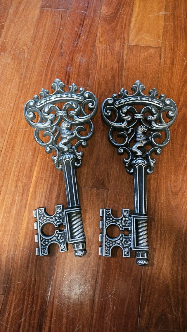 18Selling a pair of vintage metal skeleton keys, manufactured before 2000, featuring a lion logo – perfect for rustic wall decor or vintage home accents. Unique design with intricate lion detailing. Solid metal, heavy and well-crafted. Great for adding a vintage, rustic charm to any space. Sold as a pair only. Asking: $40 for the set. Located in Richmond – Pickup or local meet-up available. Beautiful, rare pieces to elevate your home or office decor.