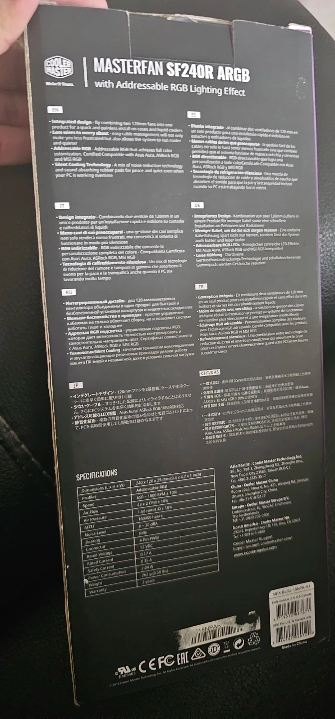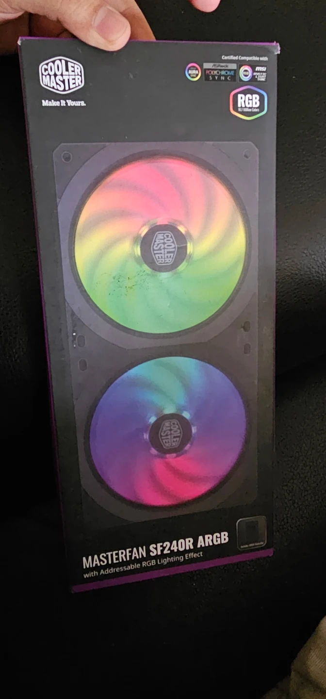 Never installed, never used and never touched. Selling a brand new Cooler Master MasterFan SF240R ARGB! This fan has addressable RGB lighting effect, which will make your PC look awesome. Dimensions are 240 x 125 x 25 mm. Make your PC cooler and more stylish!
