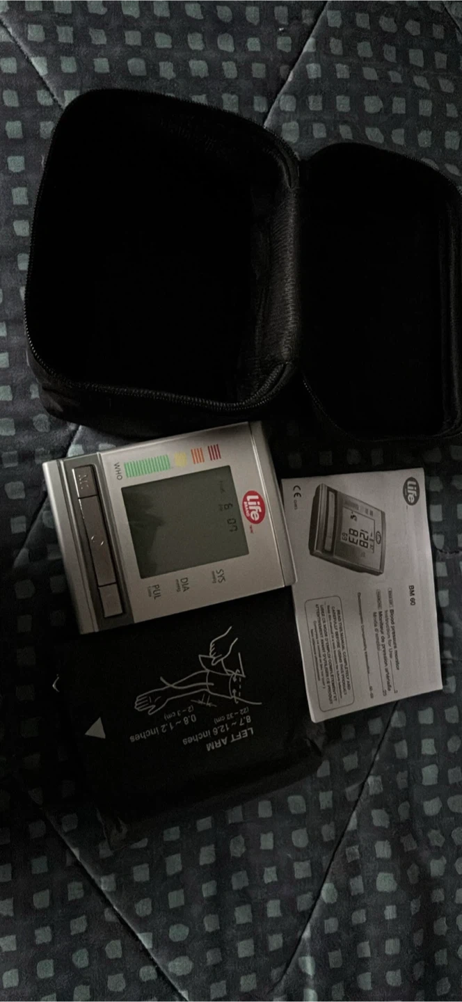 Selling a Life Brand BM 60 blood pressure monitor. It comes with the carrying case and instruction manual. The left arm cuff measures 8.7~12.6 inches (22-32 cm).