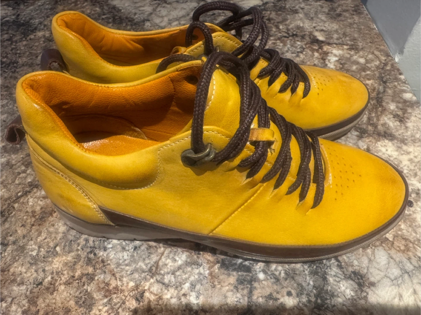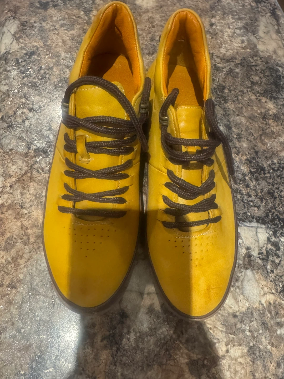 Step out in style with these vibrant, like-new Cow Leader shoes, size 39, featuring a unique mustard yellow leather and durable construction; these shoes are sure to turn heads. The shoes are in excellent condition,These shoes have only been worn twice.