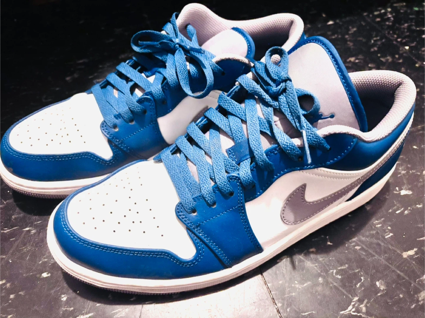 Selling a pair of Nike Air Jordan 1 Low sneakers in a cool blue and white colorway! These are in great condition and ready for a new home. Perfect for adding a pop of color to your everyday look!