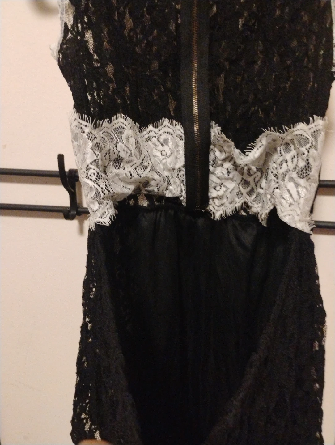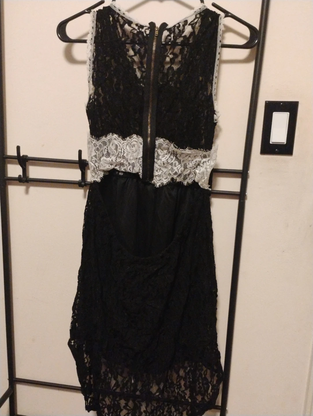 Selling a black lace dress with white lace detailing. It has a zipper in the back. Perfect for a night out or a special occasion!