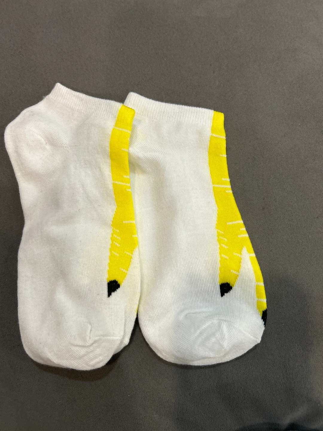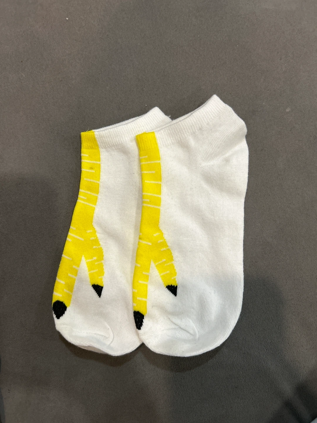 These are a pair of white ankle socks with a fun chicken feet design in yellow and black! They have never been worn before and ready to add some quirky style to your sock drawer