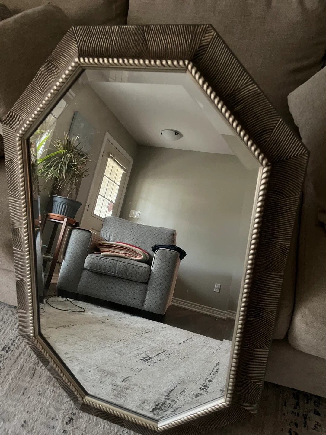 Selling a decorative octagon mirror in great condition! The frame has a unique textured pattern. It would look great in any room! Can be hung vertical or horizontal.