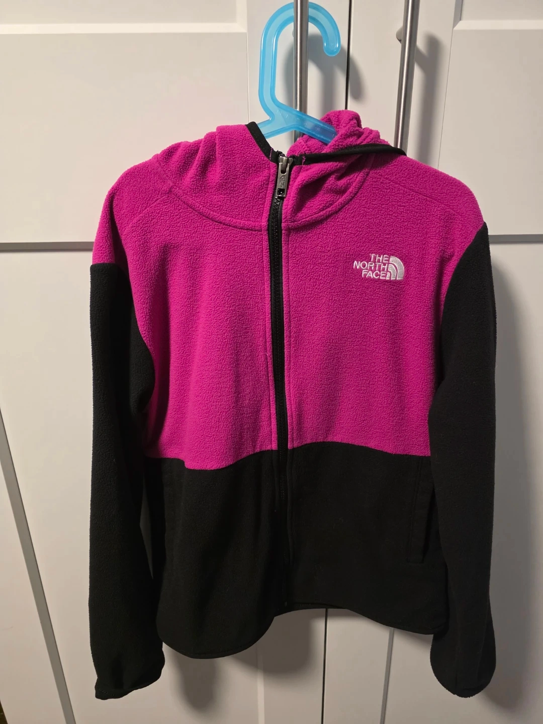 Cozy The North Face fleece jacket in teen size large. It's a vibrant pink and black colour-blocked design with a full zip. Perfect for layering!