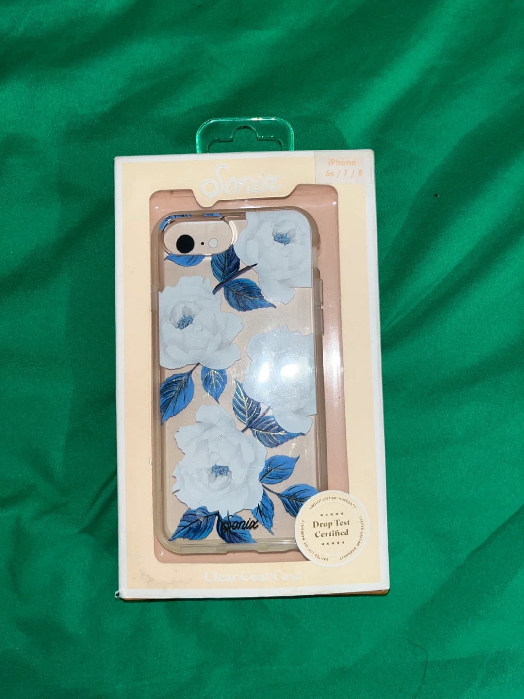 209Selling a Sonix clear coat case for iPhone 6s, 7, or 8. It features a lovely floral design with white roses and blue leaves. The case is drop test certified, providing good protection for your phone