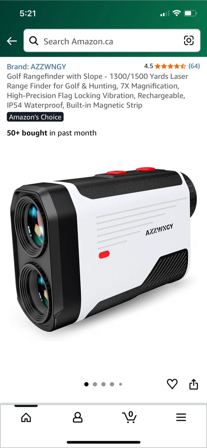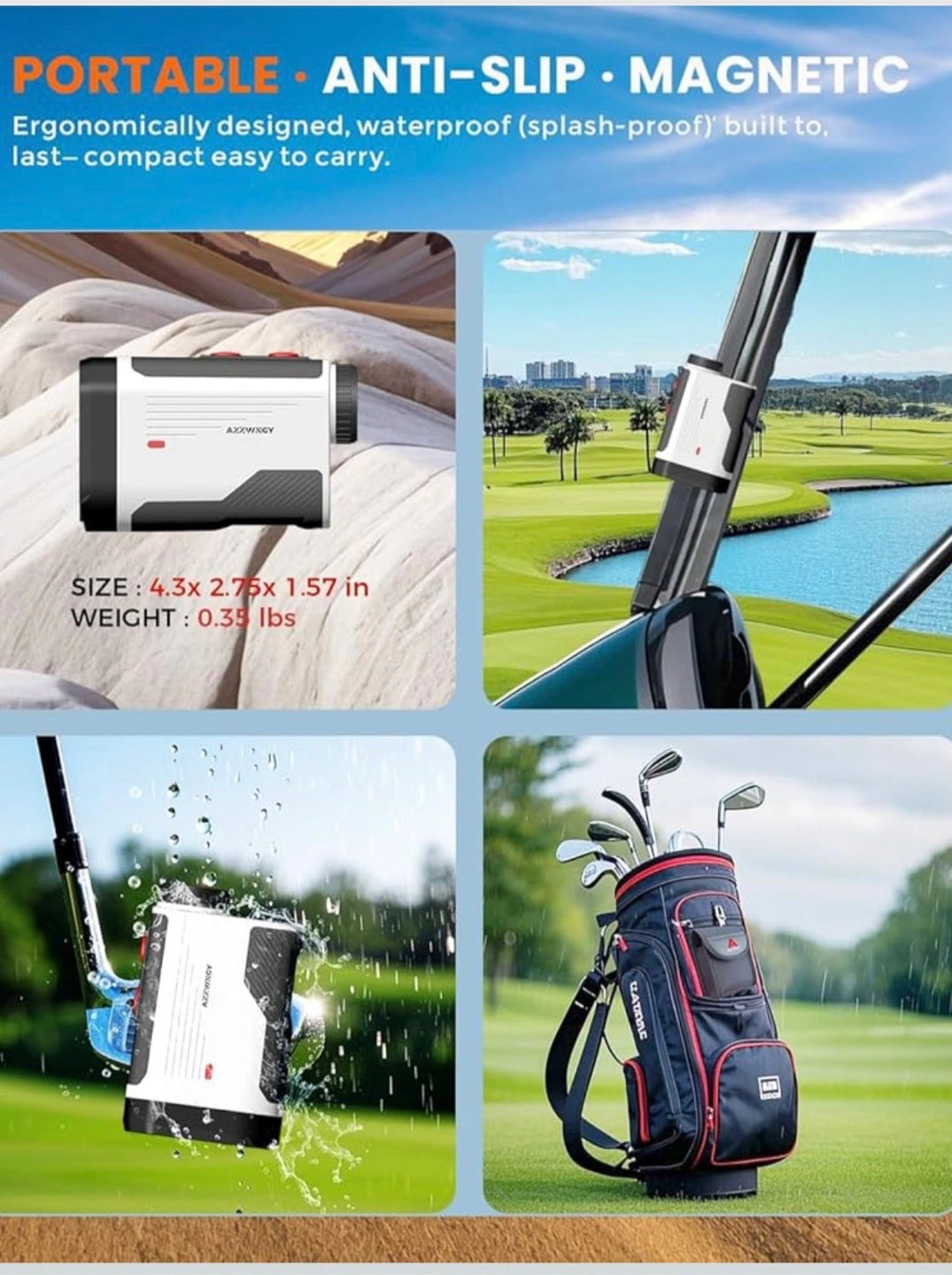 a golf rangefinder by AZZWNGY! It has slope compensation, 7X magnification, high-precision flag locking vibration, and is rechargeable. It's also IP54 waterproof and has a built-in magnetic strip. Originally bought for $129.99!