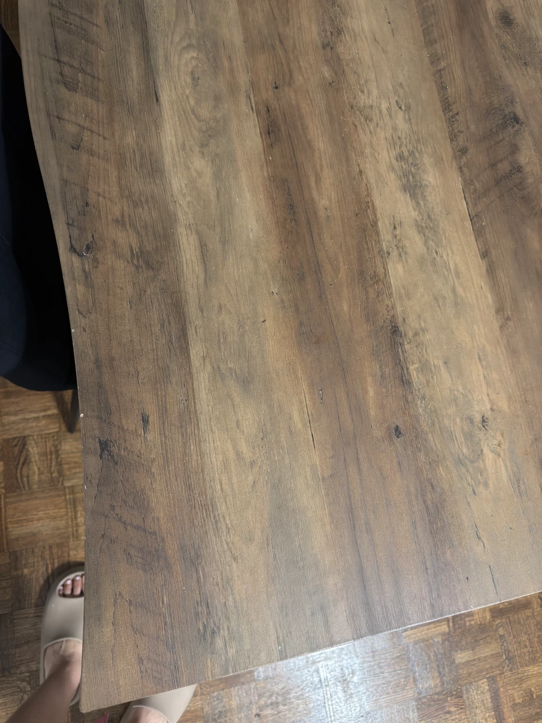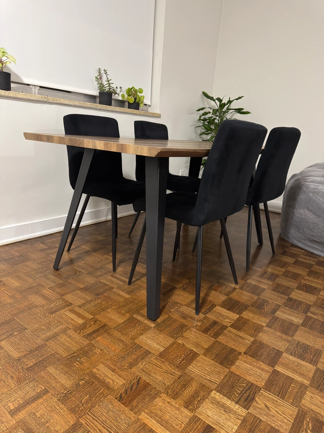 Selling a dining table with four stylish black velvet chairs! The table has a wooden finish and the chairs are a sleek black velvet. Perfect for a modern dining space
