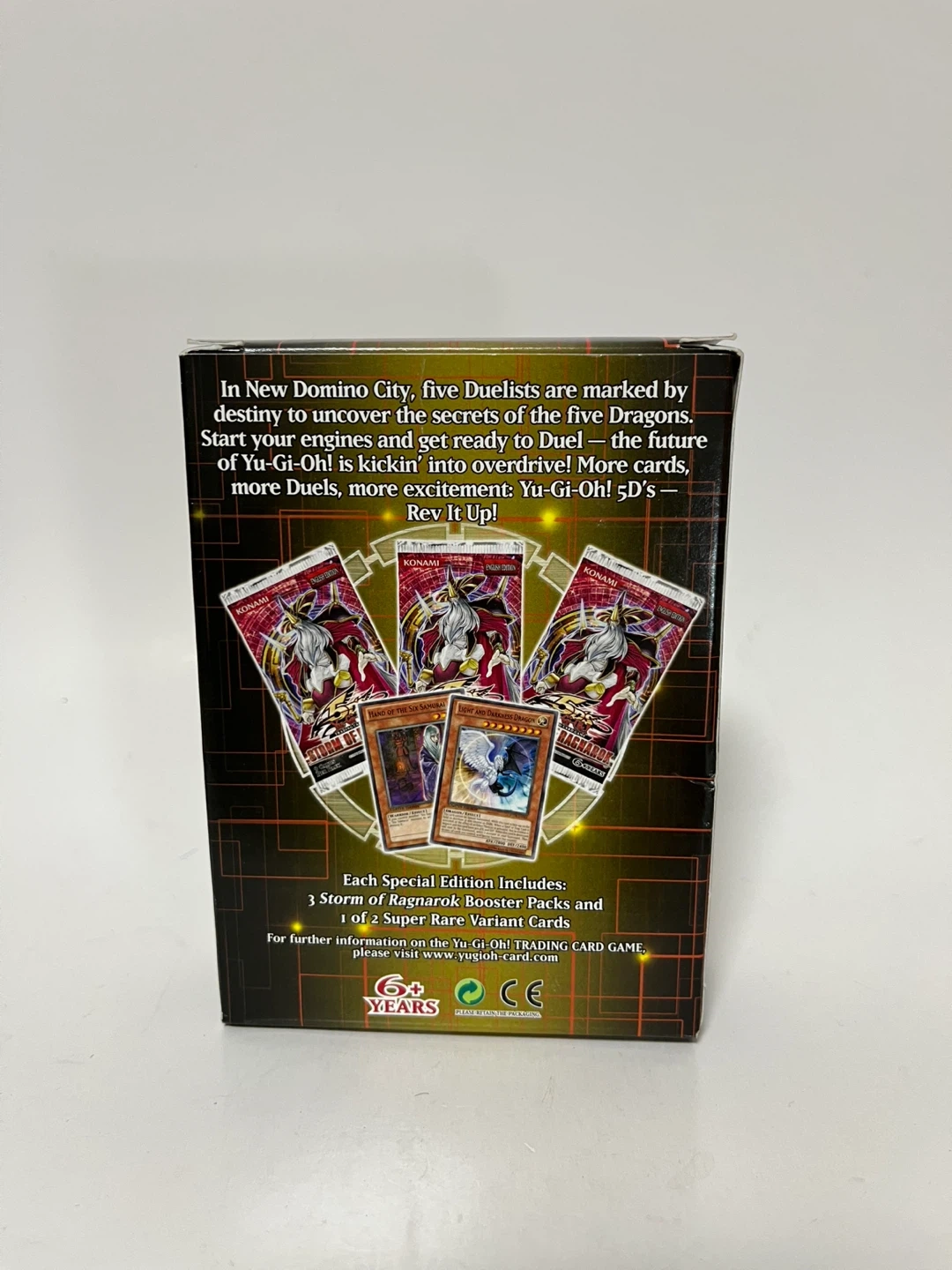 Selling a Yu-Gi-Oh! 5D's Storm of Ragnarok Special Edition set! It includes 3 Storm of Ragnarok booster packs and 1 of 2 Super Rare Variant Cards. Get ready to Duel!