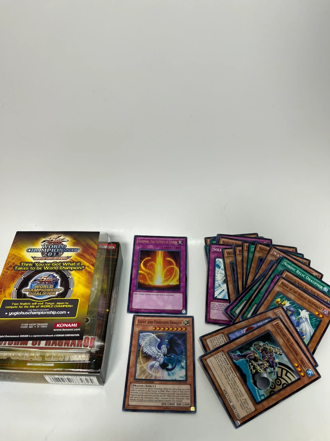 Selling a Yu-Gi-Oh! 5D's Storm of Ragnarok Special Edition set! It includes 3 Storm of Ragnarok booster packs and 1 of 2 Super Rare Variant Cards. Get ready to Duel!