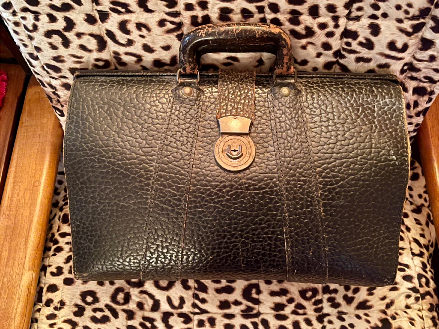Selling a vintage leather doctor's bag. It shows signs of wear, which adds to its unique character. The leather has a textured finish, and the interior has multiple compartments. Perfect for collectors or those who appreciate vintage items. Functional condition with working clasp. Measures approximately 16 x 12 x 6".