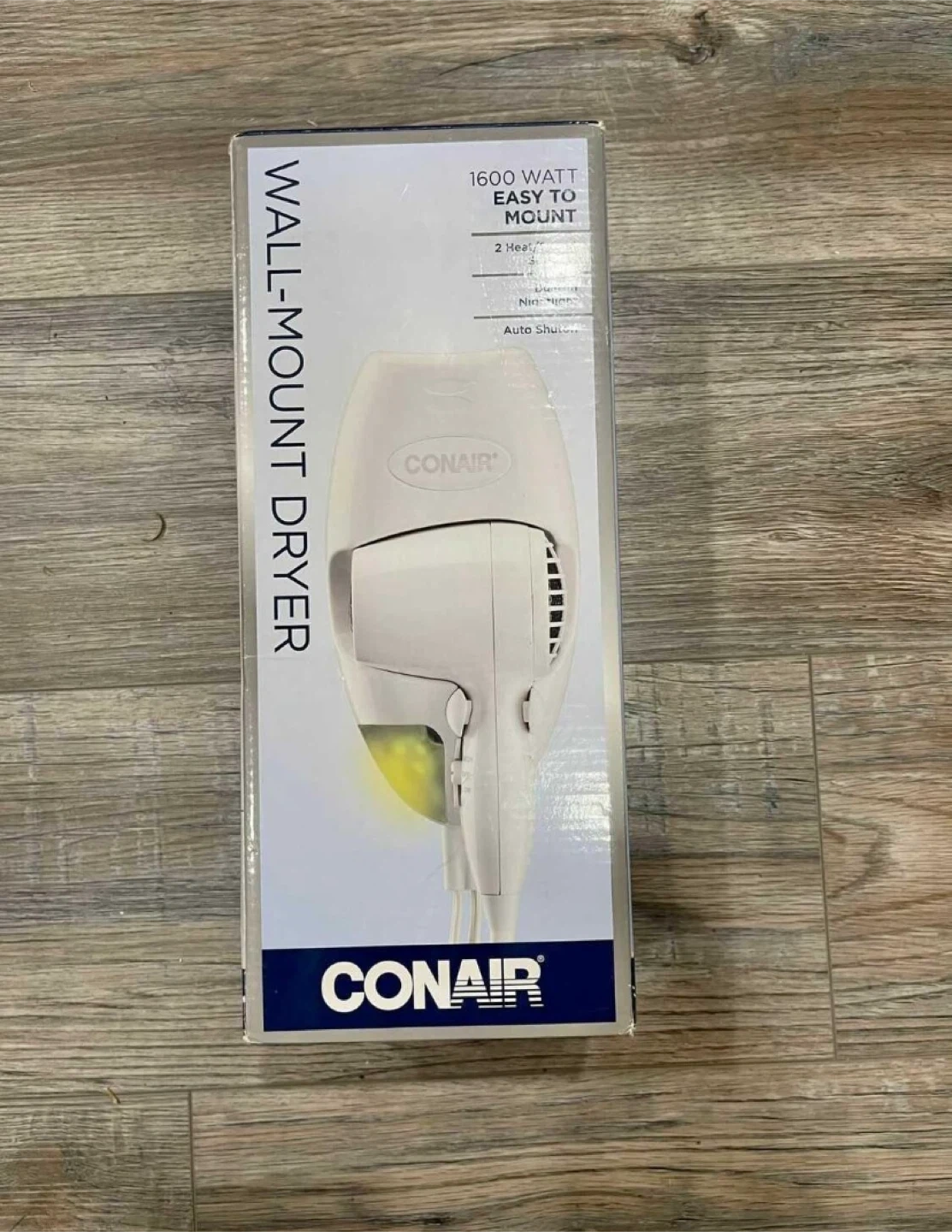 Selling a brand new Conair wall-mount hair dryer! It's a 1600 watt dryer that's easy to mount. It has 2 heat/speed settings and an auto shutoff feature. Plus, it comes with a nightlight and a 6 ft coil cord. The box is included!