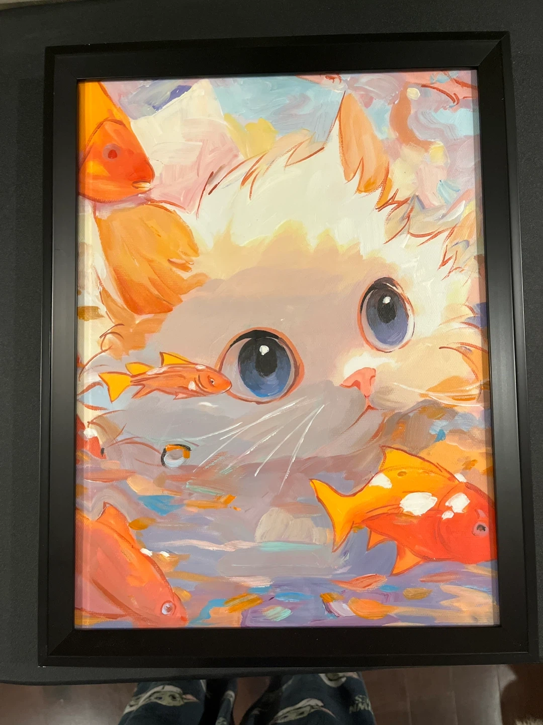 65A framed painting featuring a cat and fish. The painting is in a black frame.