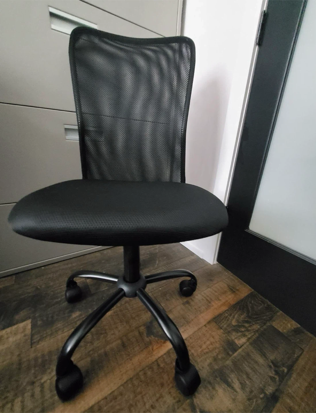 Voici une chaise de bureau noire élégante avec un dossier en filet aéré, idéale pour le confort et le soutien pendant les longues heures de travail. Cette chaise d'occasion est en bon état et offre une assise confortable. Sa conception compacte s'adapte parfaitement à tout espace de travail.