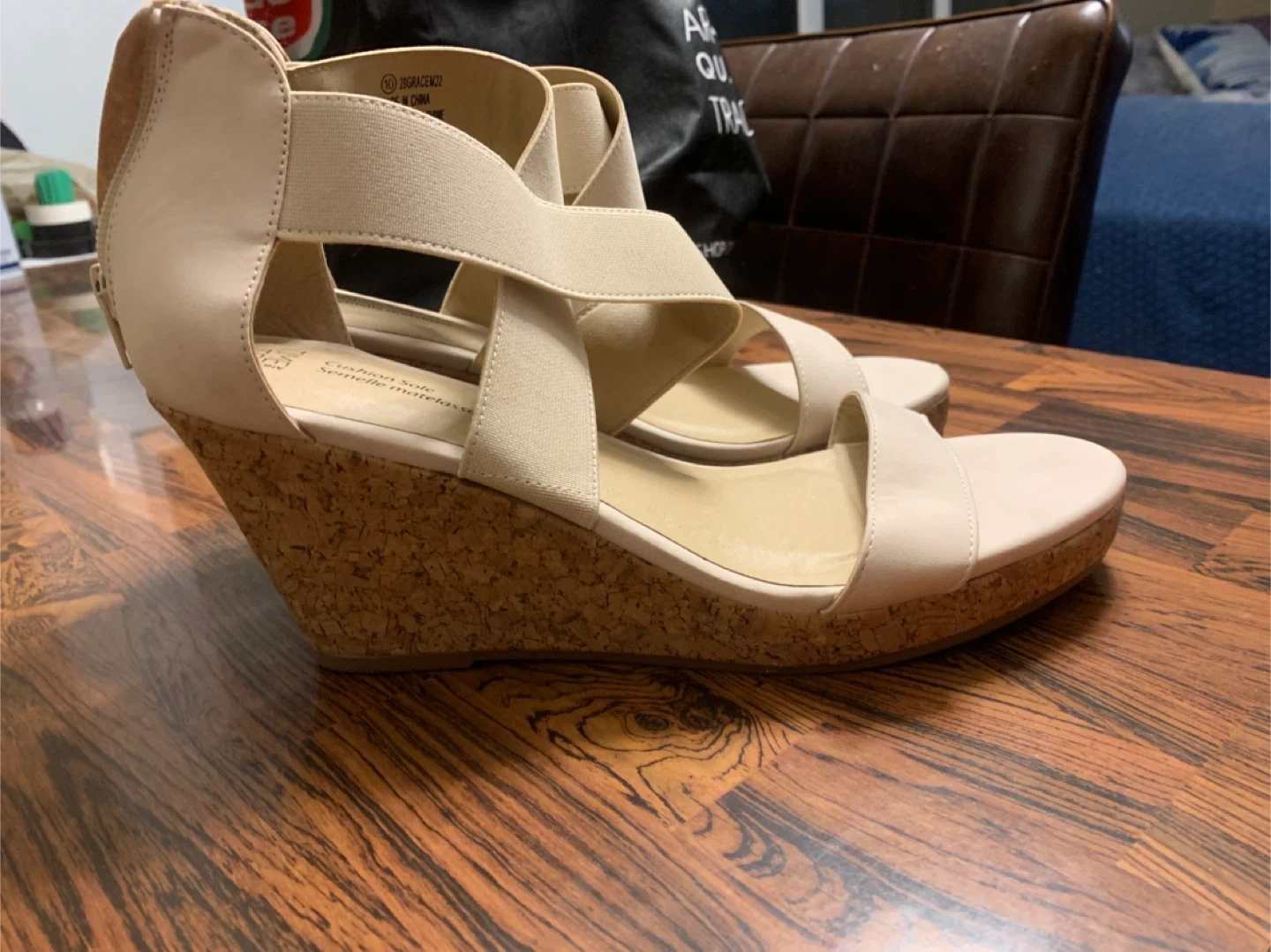 Selling a pair of Time and Tru wedge sandals in size 10. They feature a comfortable cork sole and a stylish cross-strap design. Perfect for adding a little height and flair to your summer outfits!