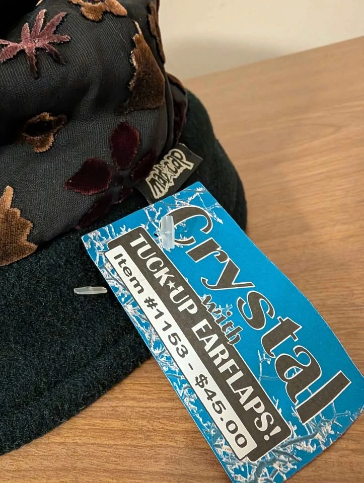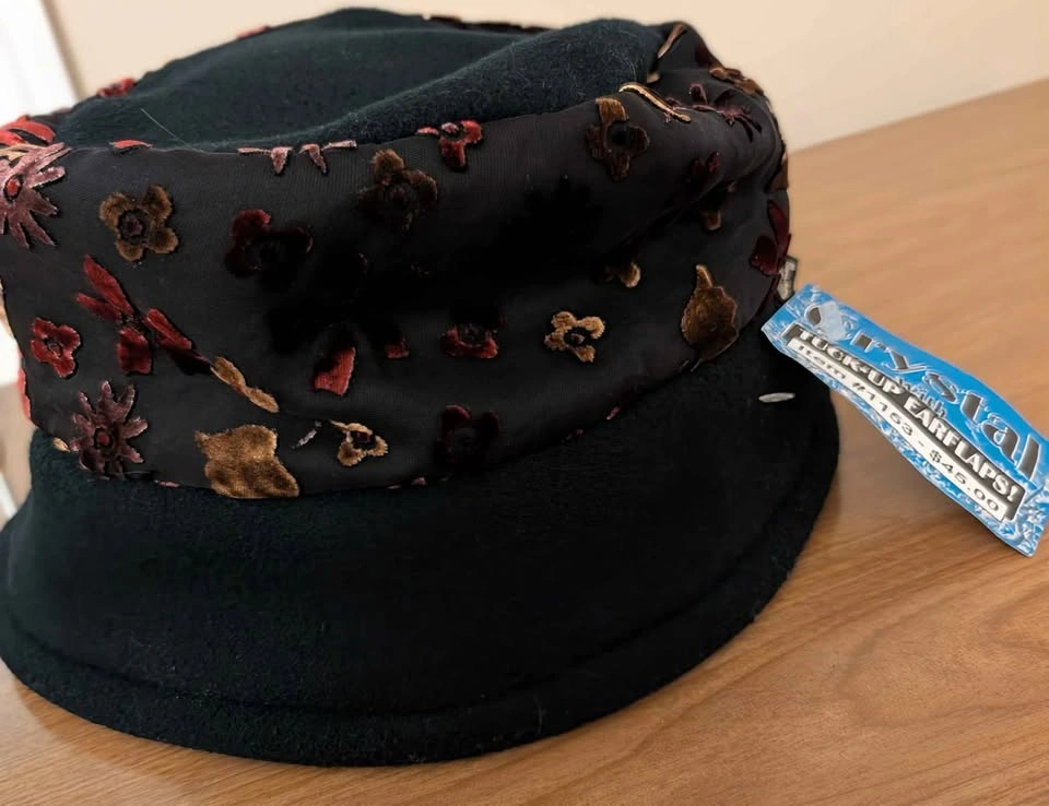 This vintage inspired fleece bell -shaped hat with the velvet floral band is reminiscent of the 1920's cloche style. It is a very warm hat and covers the ears. It was designed with hair loss coverage in mind. New with tags.