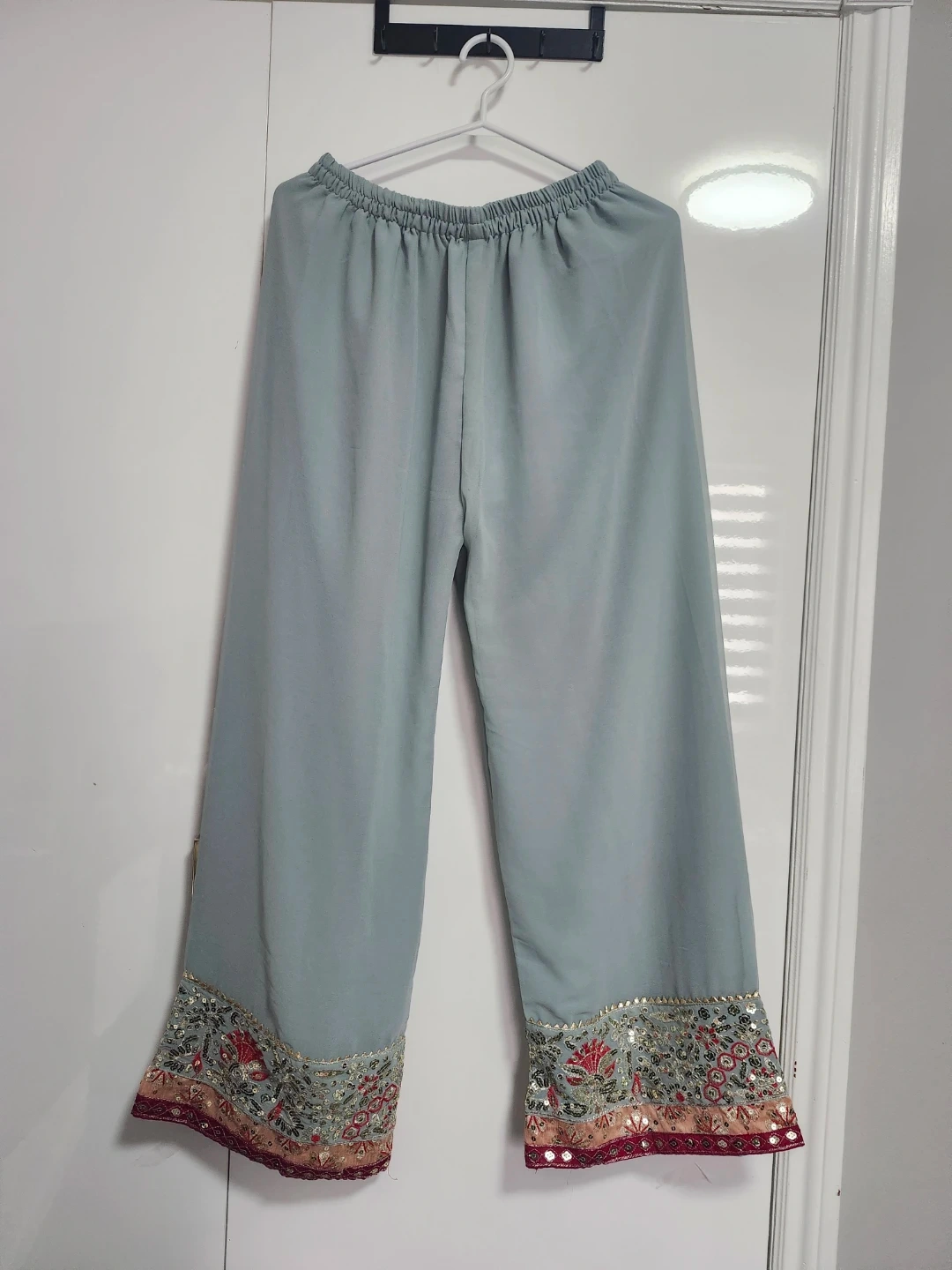 67Beautiful Indian salwar kameez suit, perfect for a special occasion! The set includes a kameez (tunic), salwar (pants), and a dupatta (scarf). The suit is size 44 . The fabric is a lovely light blue with intricate embroidery and sequin detailing. The dupatta is a soft pink with matching embroidery.