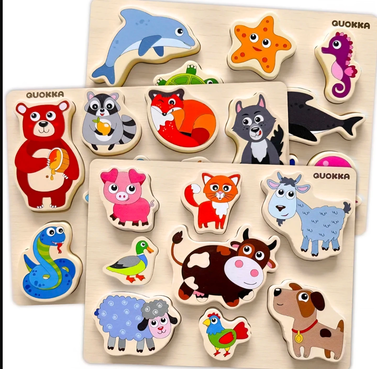 131QUOKKA Wooden Puzzles for Toddlers 2-4 – Chunky Matching Puzzles Set –Toddler Montessori Animal Toys with Jumbo Animals Toddler Puzzles Ages 1-3 I FSC Certified -Woodhigh-quality FSC-certified wood ensures eco-friendly and safe play; smooth, splinter-free finish and non-toxic paints make these wooden puzzles for toddlers 1-3 a durable and sustainable choice for early learningIntroducing the QUOKKA Wooden Puzzles, a delightful set designed to inspire young minds! Perfect for toddlers aged 1 to 5 years old, these Animal Peg Puzzles offer a fun and educational way for children to learn and play. Each set includes three charming wooden puzzles featuring colorful animal designs. With easy-to-grasp pegs, these puzzles are spe PLAY LONGER AND MORE OFTEN: kids can play beyond the puzzle board with more than 25 extra-thick wooden puzzle pieces; Use pieces independently for storytelling and shape recognition; a great addition to montessori toys for 2 year old collections PERFECT MATCHING PUZZLES: Each puzzle features printed images on both the board and pieces, making them ideal puzzles for toddlers 1-3; helps toddlers self-correct, recognize patterns, and improve fine motor skills while enjoying this engaging play EXTENDED PLAY & EARLY LEARNING: Slight variations in illustrations make every matching attempt a new discovery; labeled animals help kids learn new words while playing; a great way to develop solid language skills for toddler puzzles ages 2-4 PERFECT GIFT FOR TODDLERS: A thoughtful educational choice for birthdays, holidays, or special occasions; Vibrant colors and jumbo pieces engage young minds; great wooden puzzles for toddlers 3-5 and younger learners exploring hands-on activities