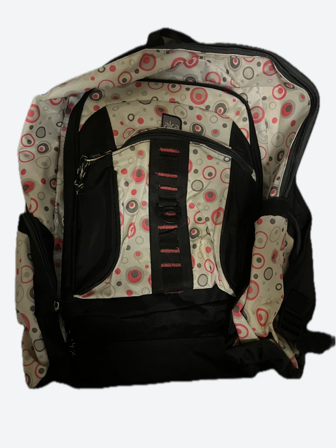 Here's an AKA backpack in good condition! It features a black base with a white and red circle pattern on the upper portion and sides. Perfect for school or travel with 5 pockets.