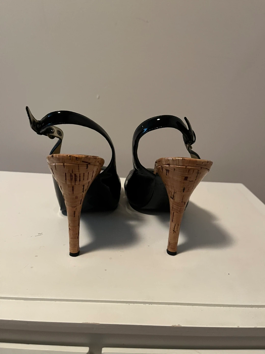Cute black patent heels from Guess! They have a cork detail and are in good condition.