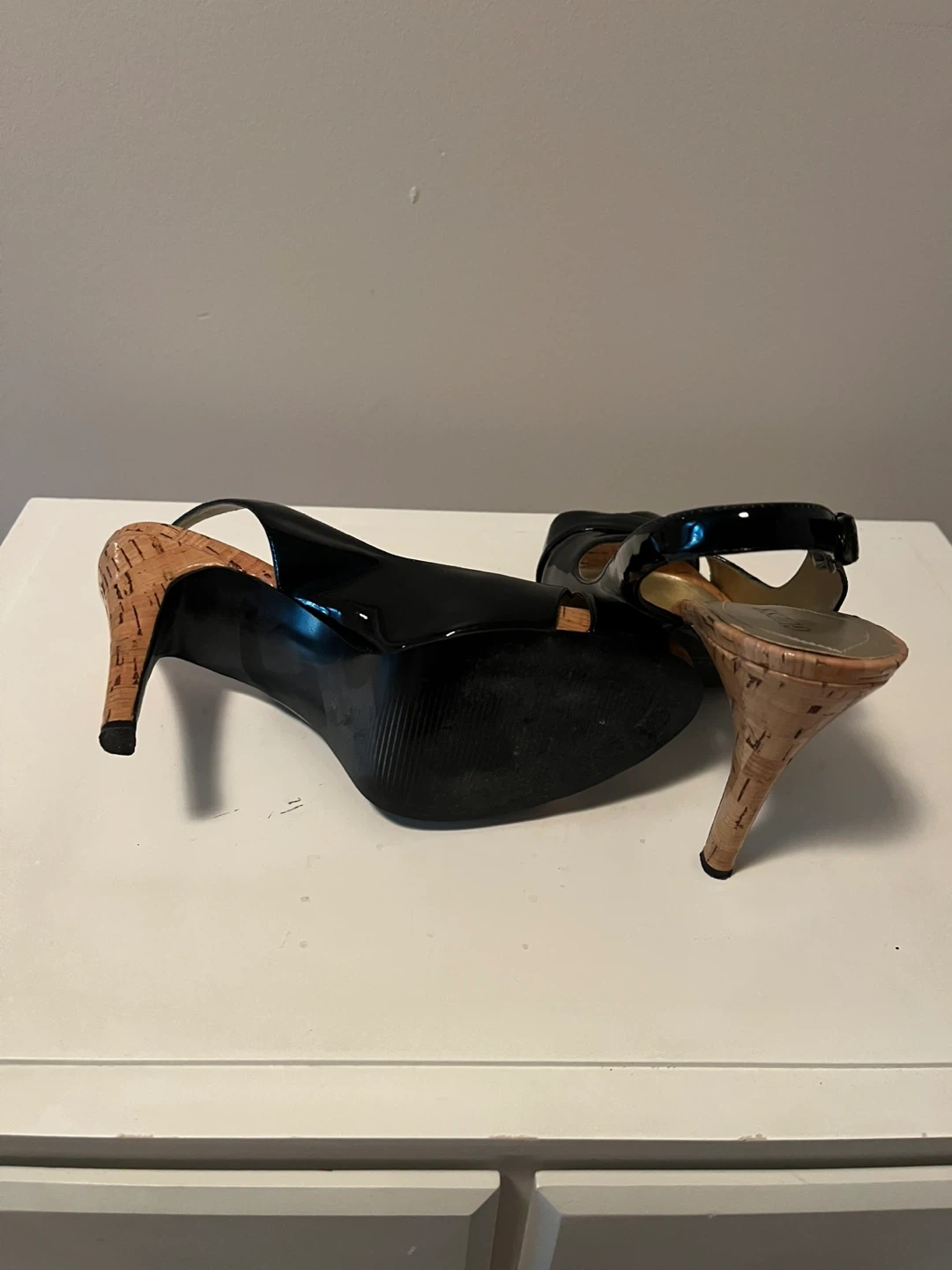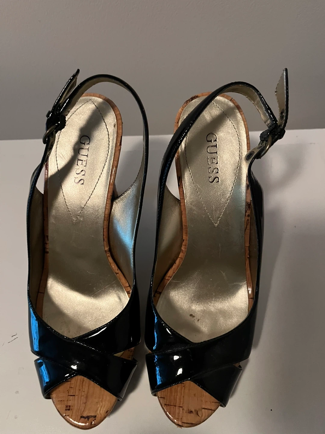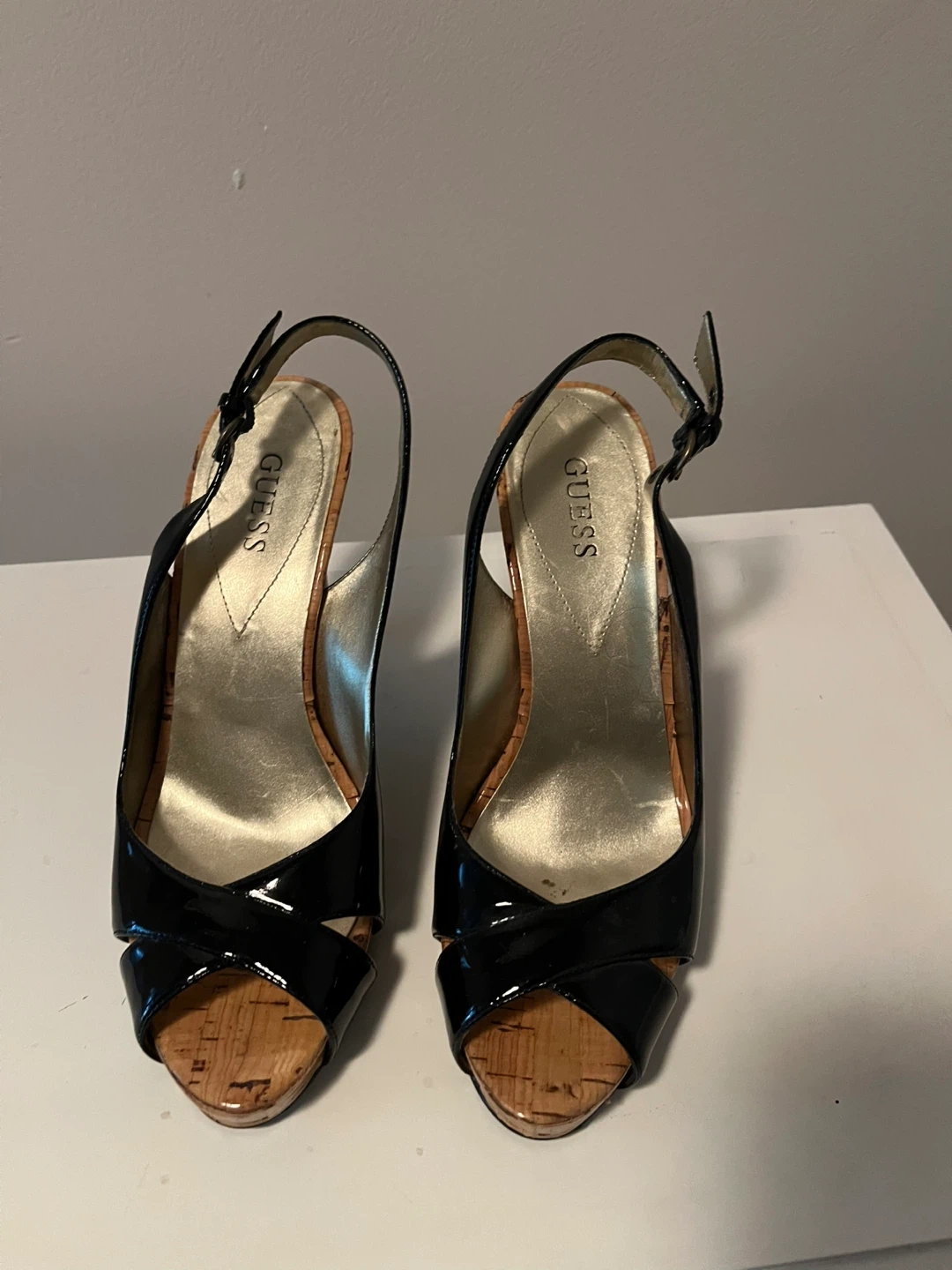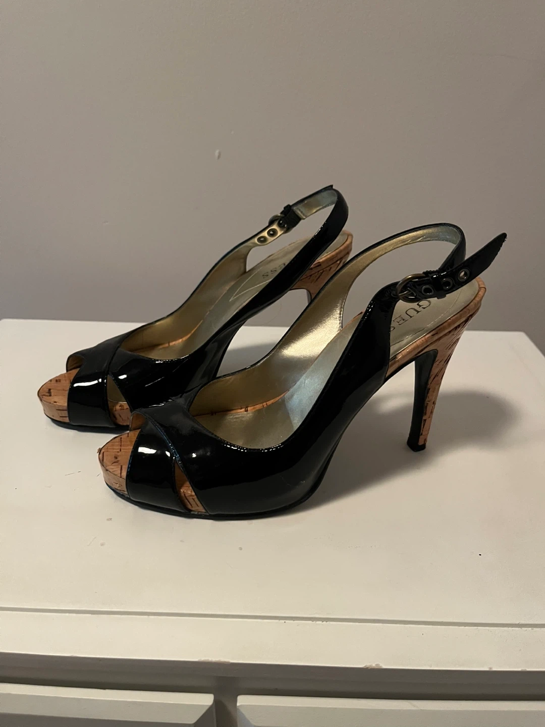 Cute black patent heels from Guess! They have a cork detail and are in good condition.