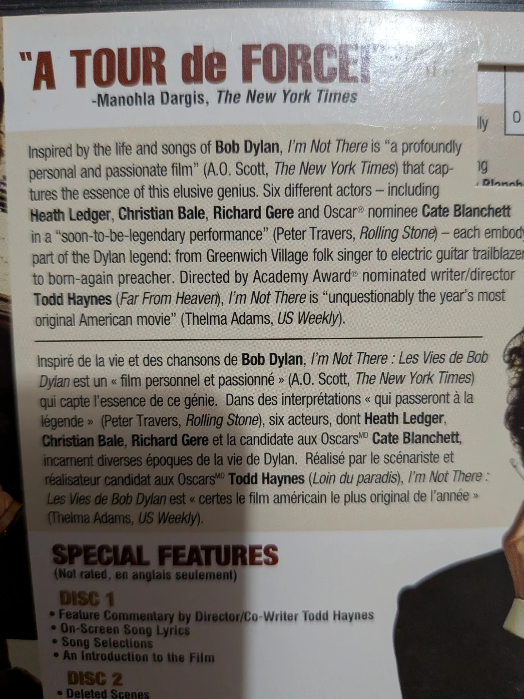 Selling the Two-Disc Collector's Edition DVD of 'I'm Not There'. This Academy Award nominated film features Cate Blanchett as Bob Dylan and an all-star cast. Enjoy special features including director commentary, deleted scenes, and more!