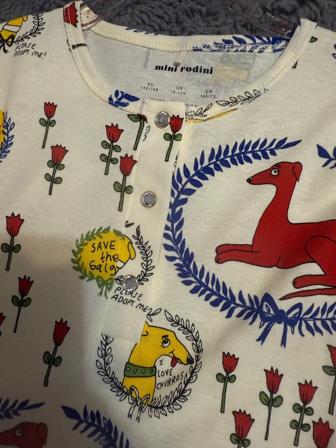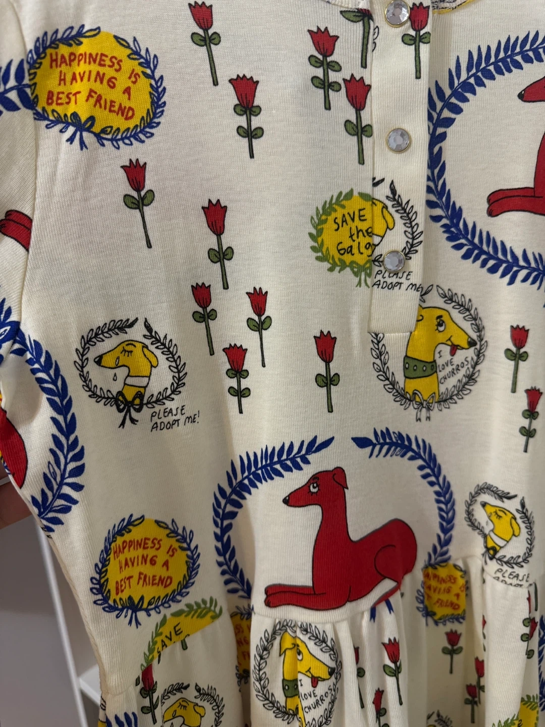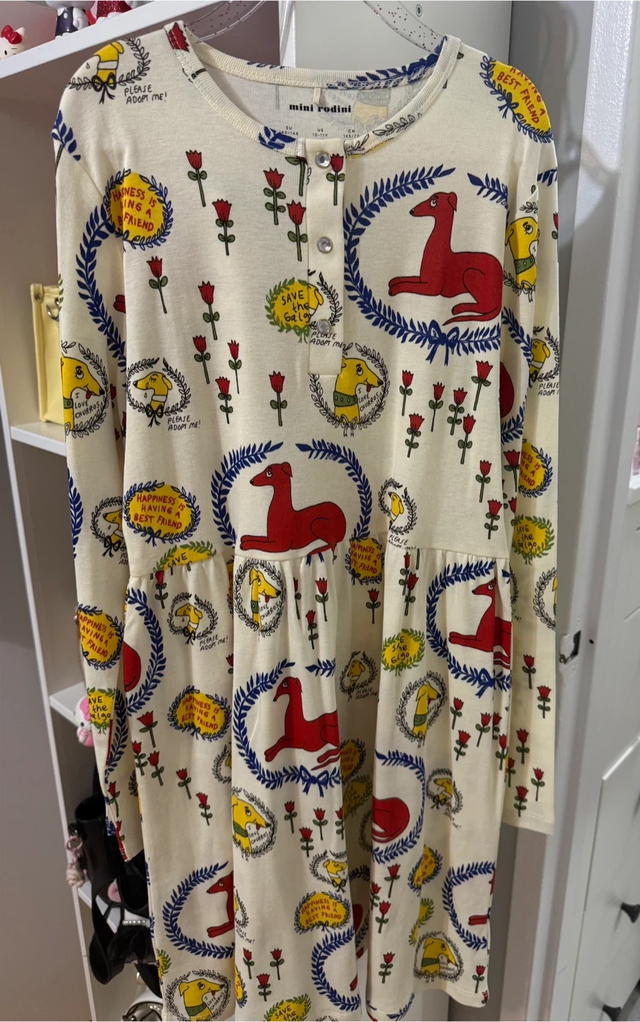 This Mini Rodini dress is in great condition and ready for a new home! The size is US 10-11Y (EU 140/146, CN 145/72). It features a fun and colourful print with dogs and roses. Made in Portugal.